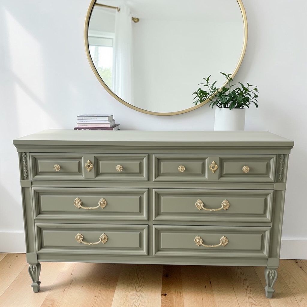 Recently refurbished vintage dresser. Painted Benjamin Moore Springfield Sage. Sanded, primed, sprayed and sealed. Orginal gold hardware. All drawers do move smoothly. Price is firm as it is based on materials used and my time. Cash only. I have other furniture listed. This dresser could be considered heavy. Will need two people to load. It is in my garage and you can back right up to it. *All of my pieces are vintage, antique or just used. Therefore, they are not perfect. Some pieces may have nicks, dings or scratches. Nothing major, everything is useable* Measurements: 30” tall 46.5” wide 19” deep Drawers: Top two: 4” deep Bottom four: 5” deep