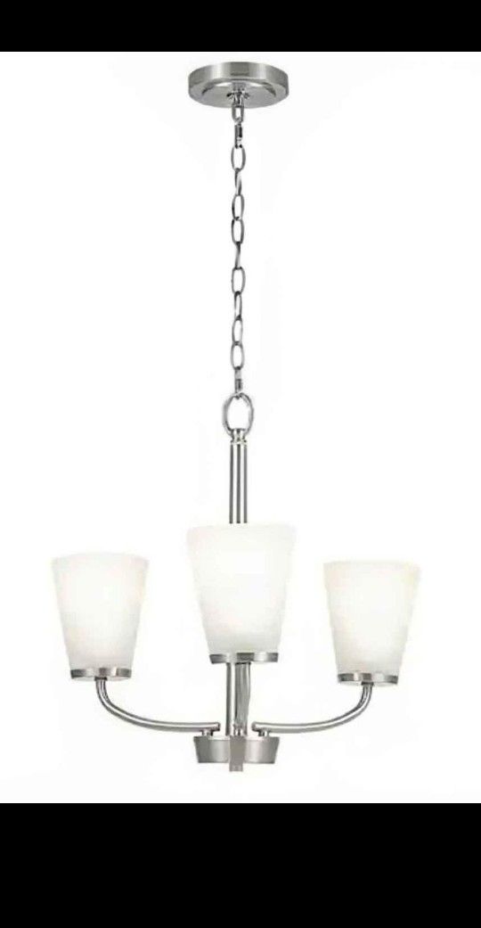 ** Click on my profile to see more items!** Retail Price $69.97 from Home Depot Asking $25 OBO Brushed nickel finish with frosted etched glass shades create ambient lighting with a modern touch. This 3-Light Chandelier features 19 in. Dia, a body height of 18 in. and an overall height of 81-1/2 in. It also features 60 in. of chain and 72 in. of wire and uses three 60-Watt (maximum) bulbs. The piece is pre-assembled and easy to install. Comes from a smoke free home There's no manual inside the box but it can easily be found on Home Depot's website.
