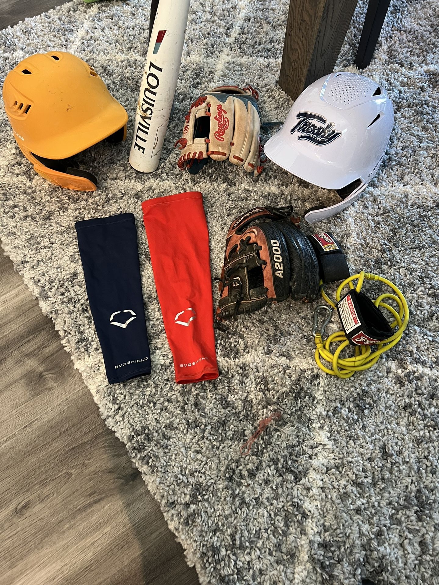 Trying to sell old baseball gear to get a new glove. Willing to be flexible on prices. I will sell any of the items individually do not have to buy all. Navy blue s/m evoshield arm sleeve - $10 Red L/XL evoshield arm sleeve - $10 Yellow/gold Rawlings R16S-REVB helmet with left handed chin protector thats optional it is able to come off. Fits head sizes 6 7/8 - 7 5/8 - $30 White evoshield helmet with right handed hitter chin protector size small- $25 yellow jaeger bands - $25 Wilson A2000 infield glove size 11.5 - $200 note- flexible on price it is used. Rawlings Heart of the Hide Dominican republic custom glove size 11.5 used - $250 Victus nox bat 32” -3 slightly used - $280 Louisville prime 919 33” -3 used needs new bat grip - $150m All together its 980 least im willing to do is 800