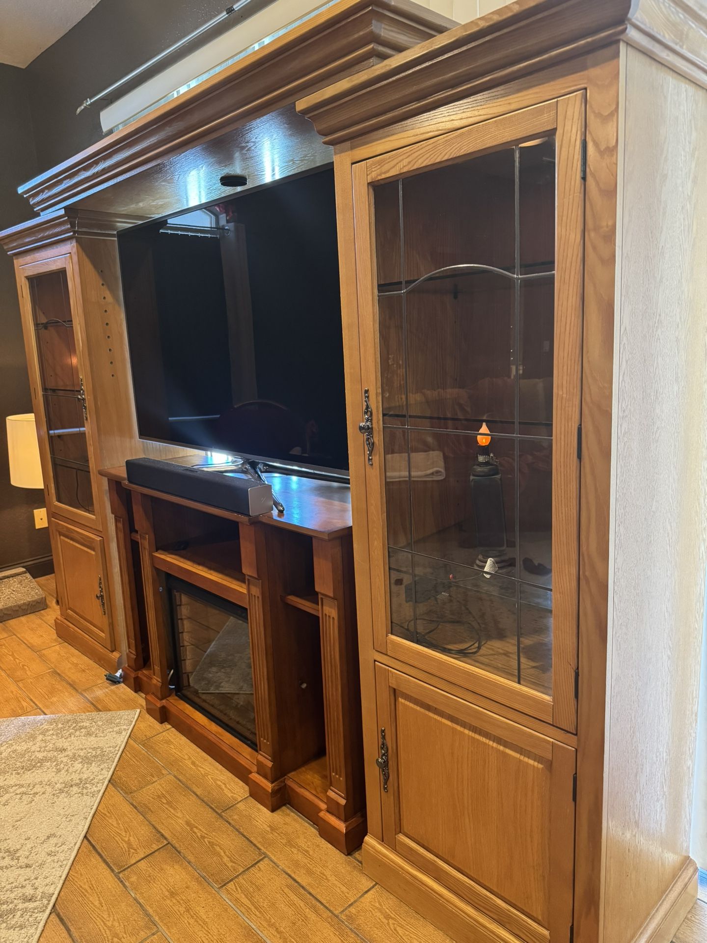 $60, solid wood, fits around your TV and stand, width is adjustable, outlet plugs inside of cabinets on both sides, lights on both sides and in center, turns on by touch, 3-way dimming, glass shelves (removable), storage inside of lower cabinets. TV stand not included. Cash and pickup only.