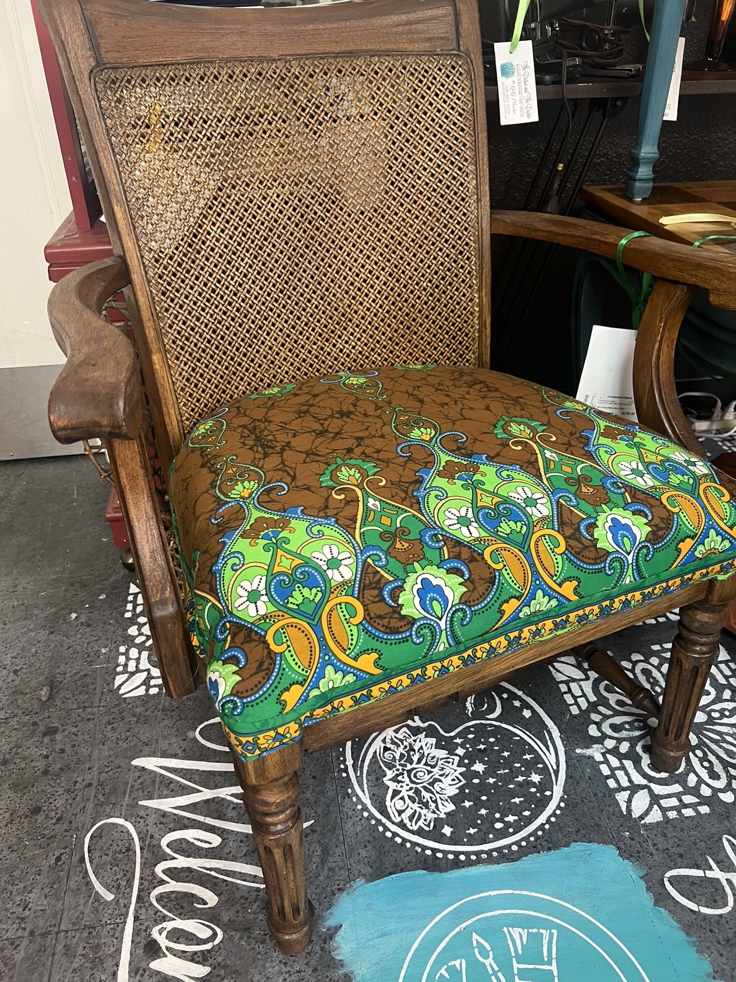 I refurbished this chair myself with new stain to match its original color, solid wood construction , all new foam, faux down and fabric seat. Came back is in like new condition. Really comfortable chair! Perfect in a living room or accent chair in your home. Dimensions 27” wide at widest 19” overall depth 32” tall at back Seat is 18” deep by 22” wide This piece is currently available in my retail space inside Consignment Classics on Kurtz. Message me for details!
