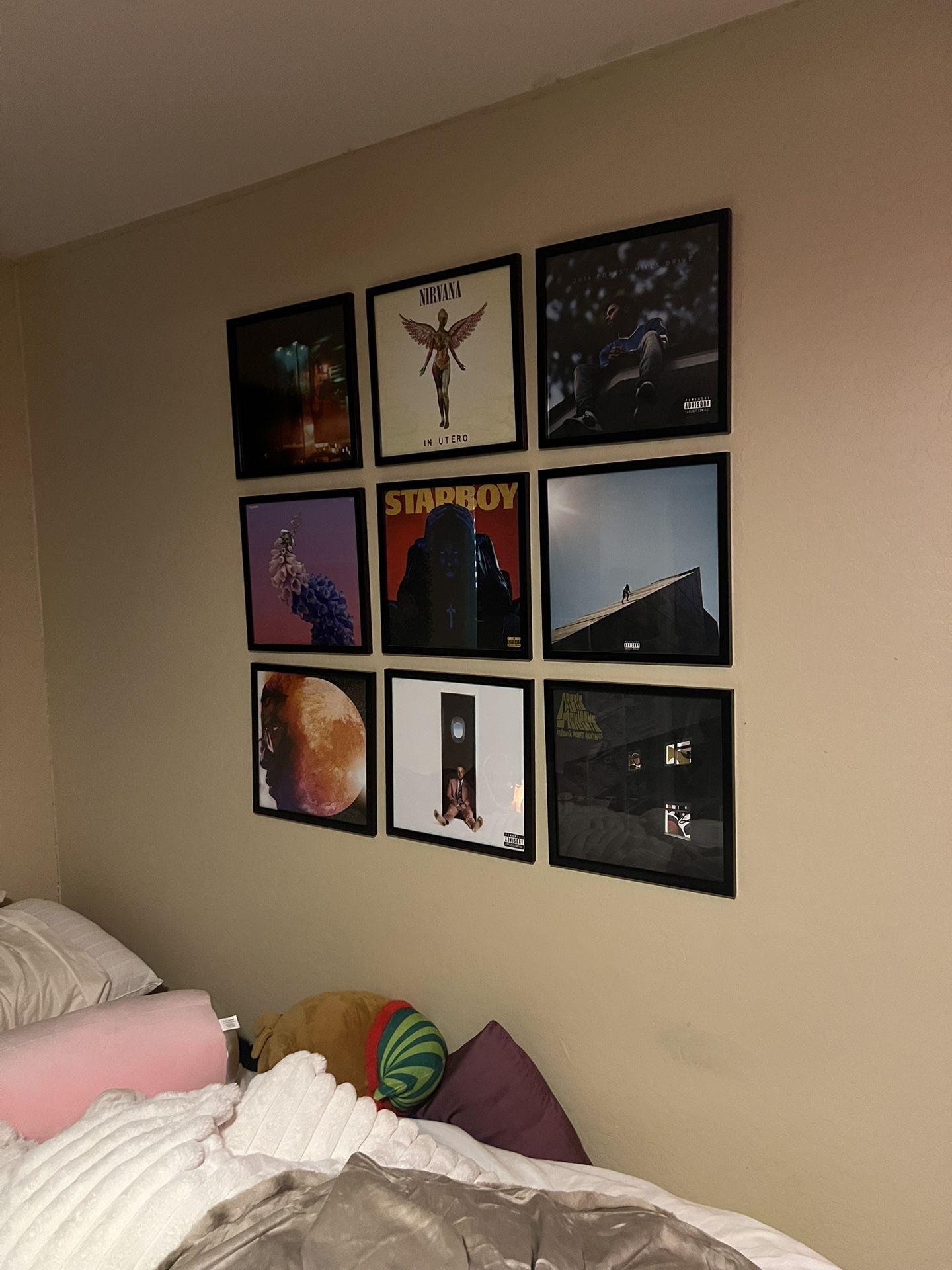 Selling my daughter’s album poster wall set, frames are included. Includes all 12 pictures & frames all 12x12. The albums are Labrinth, Nirvana, J Cle, Flume, The Weeknd, Daniel Caesar, Kid Cudi, Mac Miller, and Arctic Monkeys. $30.00