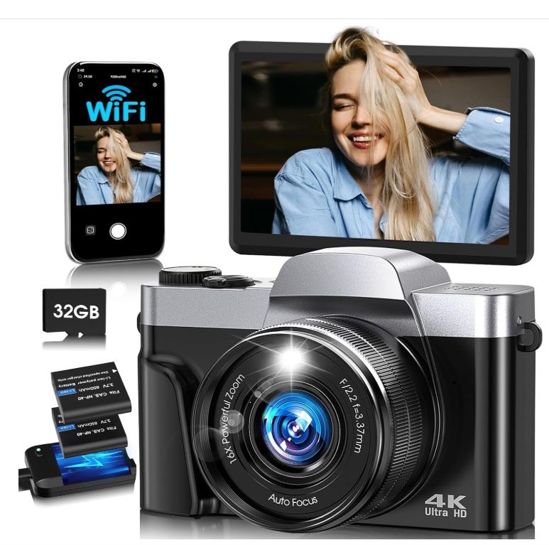 Brand new and original price 125$ but sell cheap because moving c83 4K Digital Camera for Photography with WiFi,64MP Autofocus Vlogging Camera for YouTube,3'' 180° Flip Screen Compact Travel Camera for Teens with 32GB SD Card,16X Zoom,Anti-Shake,2 Batteries(Black)