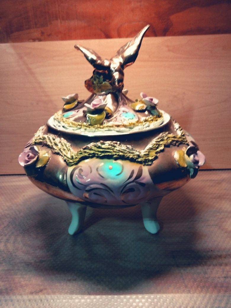 VINTAGE BEAUTIFUL ITALIAN MADE, WITH FLOWERS, DRESSER TABLE CONTAINER, WITH REMOVABLE TOP, NEVER USED, UNIQUE IN IT'S CLASS. PORCELAIN.