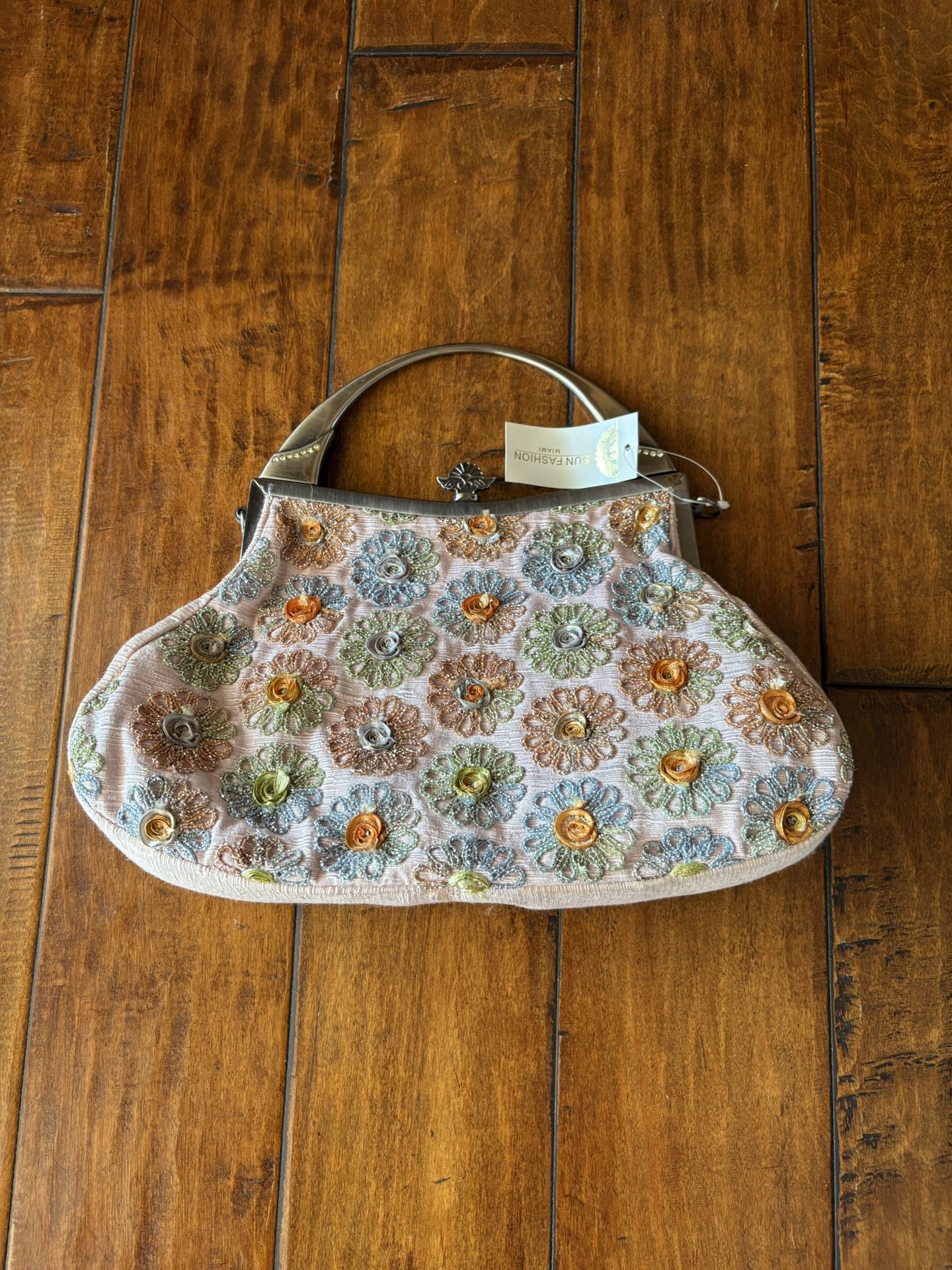Vintage style beaded Clutch Purse in pink wrinkle satin.