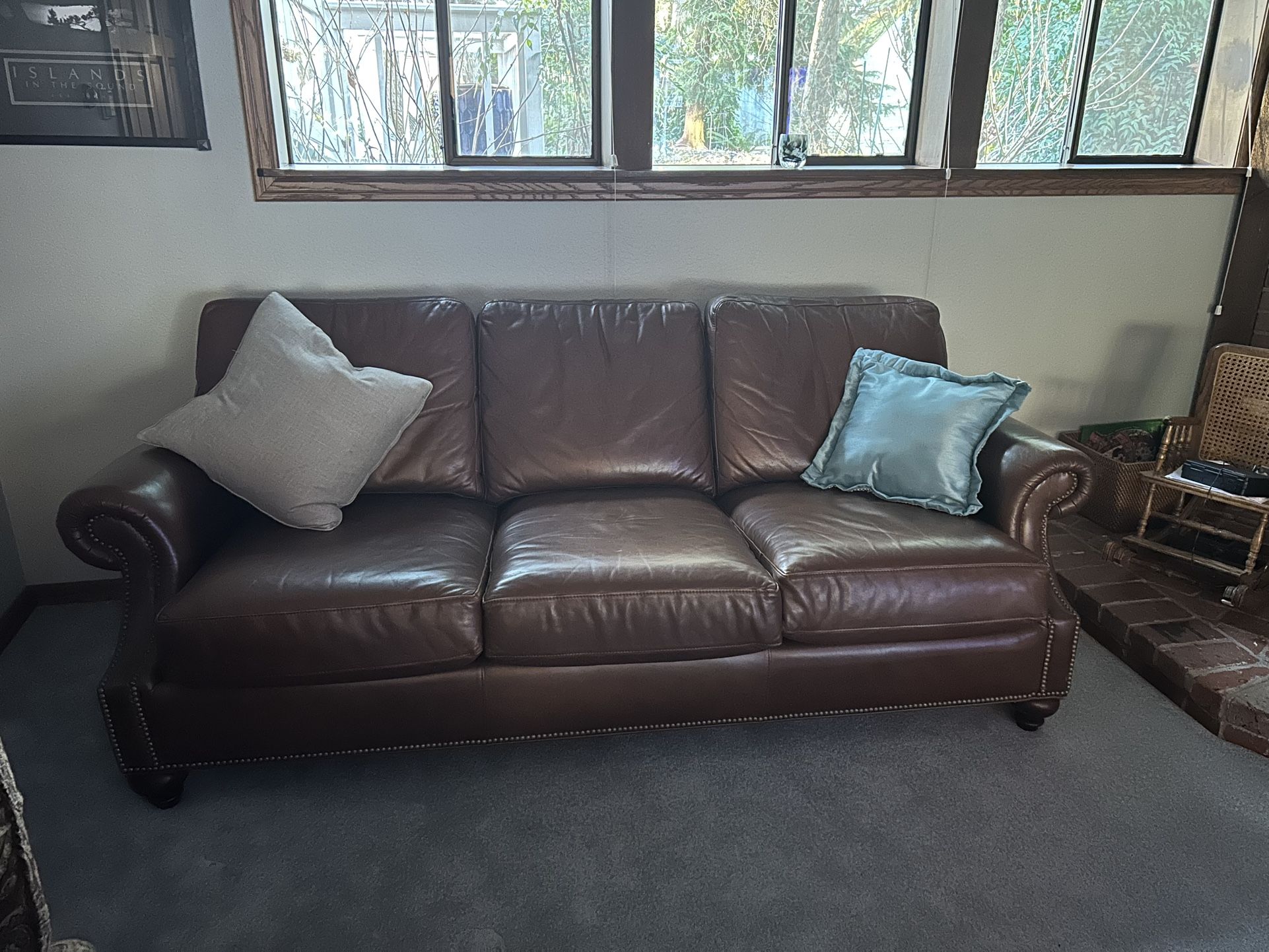 Brown leather sofa from Ethan Allen. In excellent condition from pet free home. Only one person has ever sat in it. Firm cushions. The leather has slightly faded on the left back cushion and tiny spot of fading on adjacent arm rest. Could probably be improved with conditioner. It’s not very noticeable especially with a throw pillow . Paid $3500 new about 12 yrs ago but still in great condition. Dimensions: height 31 inches, length 80 inches, depth 36 inches