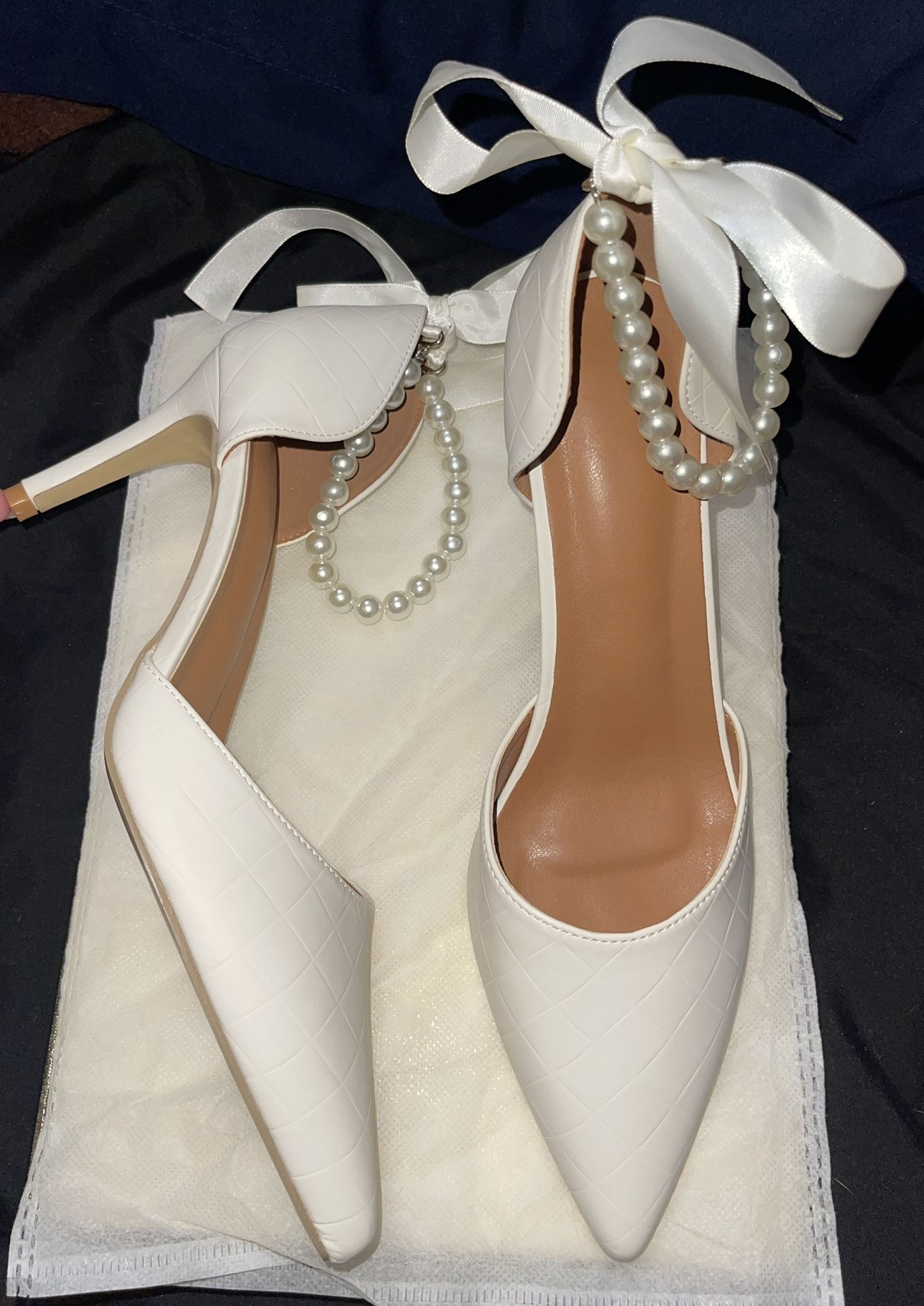 White high heels Women’s size 8.5 Adjustable beaded strap with bow tie $30 OBO