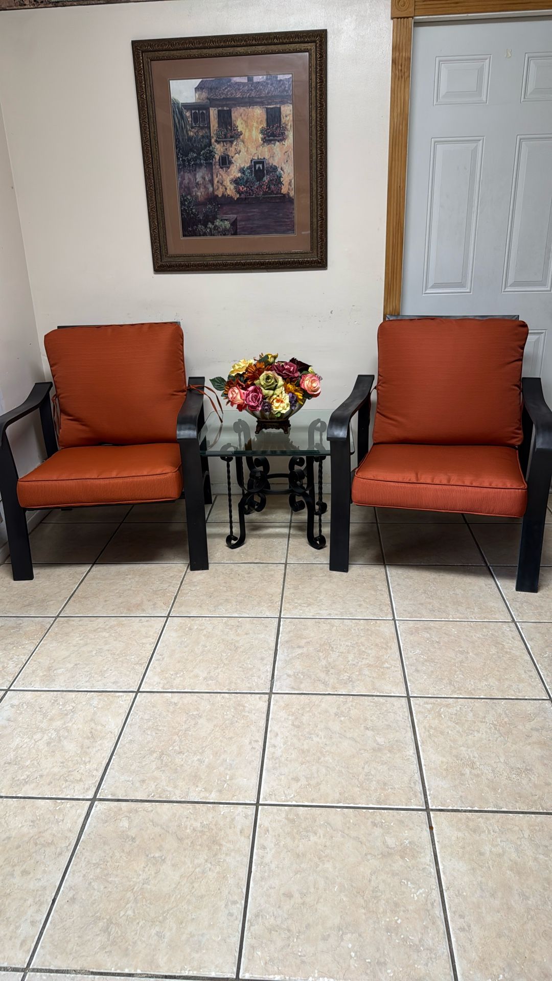 In excellent condition with new Hampton Bay cushions and a glass top table with no chips or cracks From a smoke free home Please see pictures for details