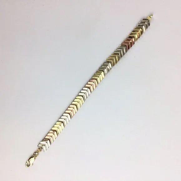 10k Tri-Color Gold Bracelet This stunning bracelet is made of 10 karat white,yellow, and rose gold featuring v-shaped links all throughout the bracelet. This bracelet is in overall excellent condition with minor scratches which are not easily seen. This bracelet measures 7 inches of length and 8.90mm of width. It weighs a total of 5.55dwt which is equivalent to 8.63 grams of gold. This bracelet is perfect for a Mother’s Day gift or even an anniversary gift! The combination between the different types of gold allow this bracelet to pop out due to the reflection it provides. Though this design seems simple, it will make a beautiful statement when seen on the body. Length: 7” Width: 8.90mm Metal: 10 karat Tri color gold Weight: 5.55 dwt // 8.63 grams 17023-1* X-101