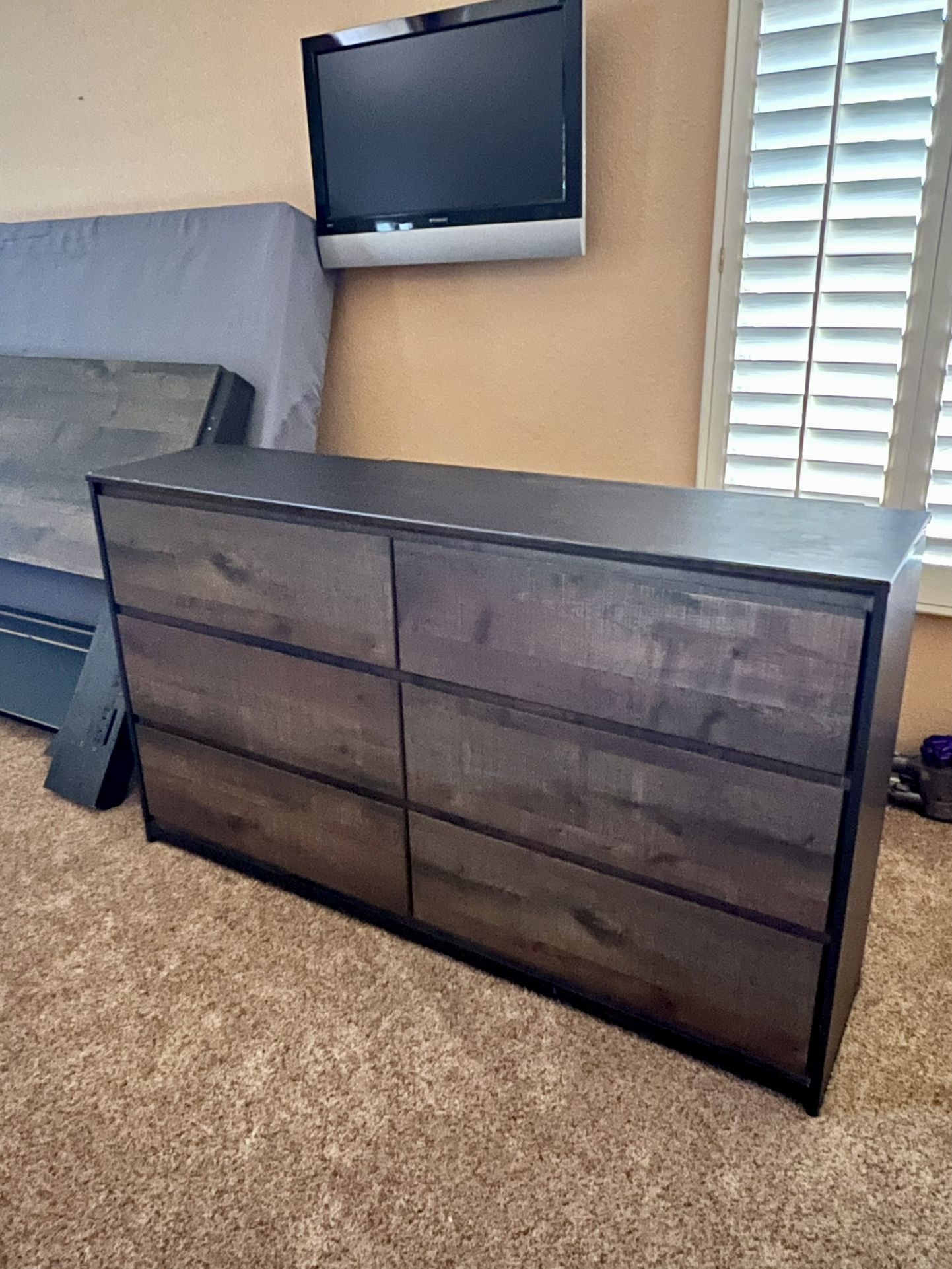 Dresser, Chest, Bed Frame QUEEN (headboard, footboard, and rails) all in great shape! Dimensions in pictures $500 Dresser and Chest $200 Queen Headboard, Footboard, Rails $600 for all 3 pieces Rich on the rustic character and decidedly simple on the details, this dresser and chest maximizes the beauty of minimalism. Free of handles and featuring inset drawers, they do more with less for stunning results. Their richly rustic oak grain character is enhanced with a two-tone finish that gives the plank-style aesthetic a highly modern feel. Dresser: Made of engineered wood Two-tone finish Plank styling 6 smooth-gliding drawers Drawers extend out to accommodate maximum access to drawer interior while maintaining safety Weight 155 lbs (70.31 kgs.) Dimensions Width :61.69 Height :36.5 Depth :14.84 Additional Dimensions Drawer interior (6) Width:27.5" Drawer interior (6) Heigh:6.5" Drawer interior (6) Depth:13" Assembled dresser Width:62" Assembled dresser Heigh:68.5" Assembled dresser Depth:15.5" Chest: Made of wood with replicated oak grain finish Two-tone finish Plank styling 5 smooth-gliding drawers Small Space Solution Drawers extend out to accommodate maximum access to drawer interior while maintaining safety Weight 125 lbs (56.7 kgs.) Dimensions Width :31.1 Height :51.42 Depth :14.84 Additional Dimensions Drawer interior (5) Width:27" Drawer interior (5) Heigh:5" Drawer interior (5) Depth:13" Bed-frame/Headboard: Weight 58 lbs (26.31 kgs.) Dimensions Width :63.15 Height :48.58 Depth :4.45 Additional Dimensions Assembled queen bed Width:63.25" Assembled queen bed Heigh:49" Assembled queen bed Depth:89.5" Rail to floor:4.13"