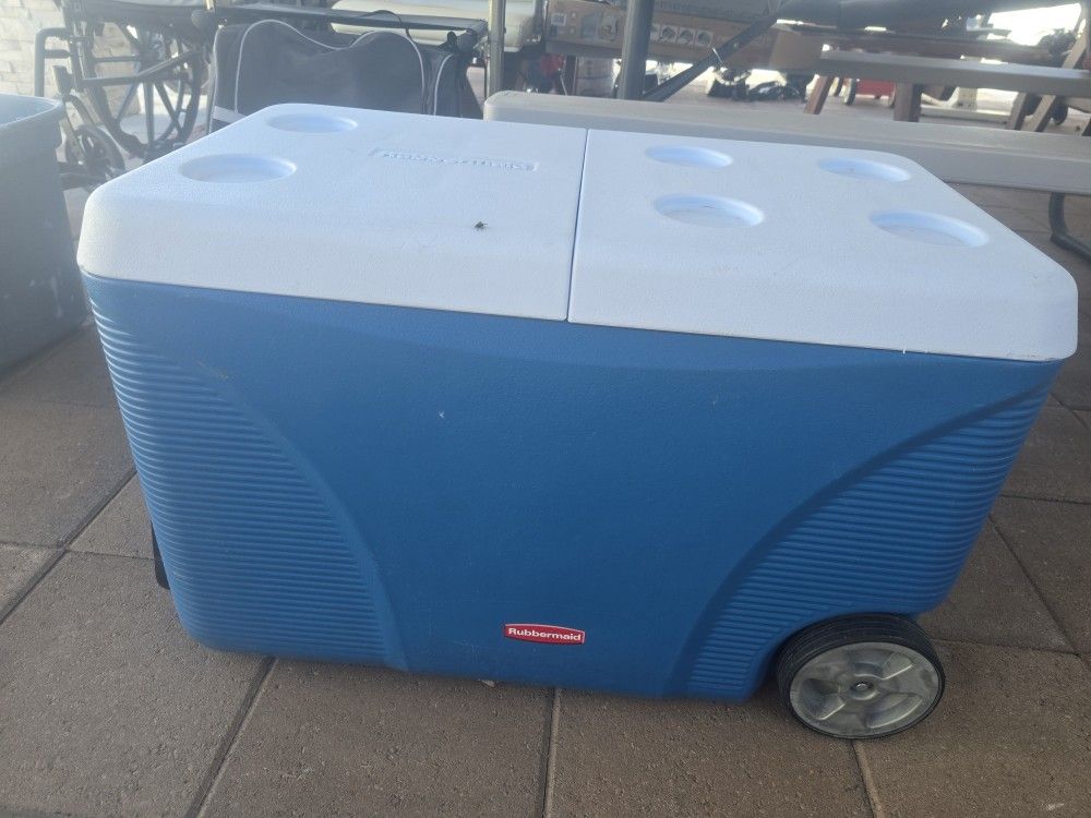 Like new condition Rubbermaid 75 quart wheeled insulated chest cooler one of the top have different hinge