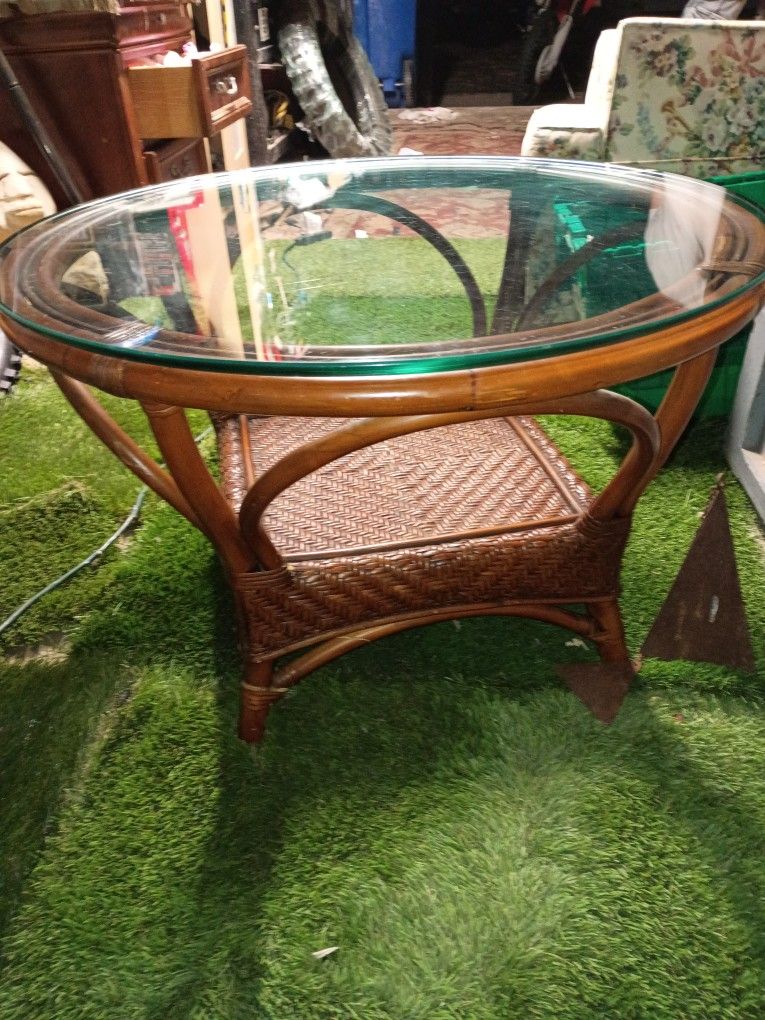 Rattan 30" diameter. Glass top. Glass is either 5/8" or 3/4” thick and is in great condition. No chips or deep scratches on the glass. This table has been in my home for a long time and I'm sad to see it go. It's a great table!