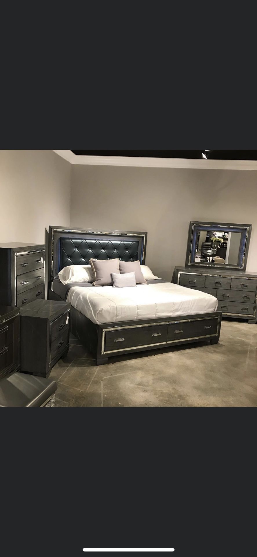 Brand new bedroom set on sale includes: Bed frame 5 drawer chest Dresser and mirror 1 night stand We carry all types of furniture like Sarah Ashley acme sunsets sofa beds Financing available three months no interest no credit check Visit us at our location and we give you an extra discount