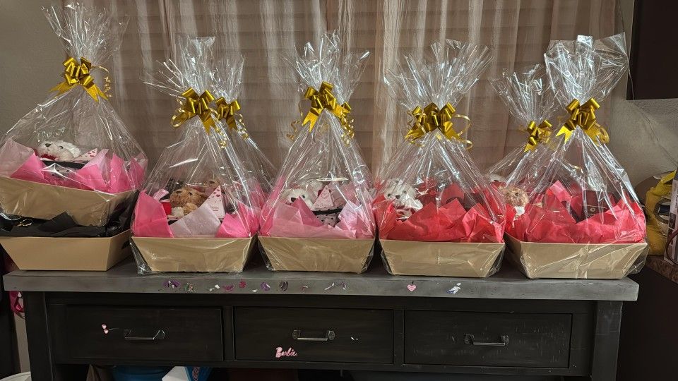 Over 90$ value in basket (different bath and body work sets in each basket) Comes with -Full set of bath and body works hydration body cream,body wash and a fragrance spray -Make up bag and design hair clip -chocolates -teddy bear with a Rose made of yarn Will also come with balloons