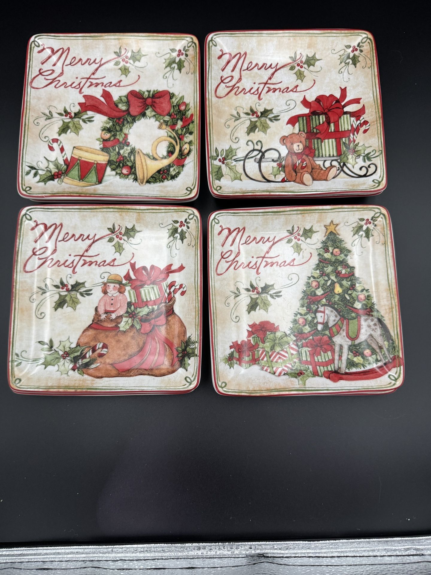 Beautiful vintage-style Christmas set. Includes 4 square plates + 4 matching cups, each with a different Merry Christmas design (wreath, rocking horse, teddy bear, Santaβs sack). Excellent condition β no chips or cracks. Perfect for holiday entertaining or π Local pickup π Cross-posted π² Asking $35