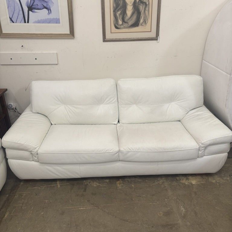 90″W x 39″D x 34″H Natuzzi Biagio B806 white leather sofa in excellent condition. Top-grain leather on use surfaces, tight seat with supportive elastic webbing, loose back cushions. 90 W x 39 D x 34 H in, seat height about 17 in. Matching ottoman available separately for additional $250. More info on this, and many other great pieces, on the Desogn Consignment Gallery Website