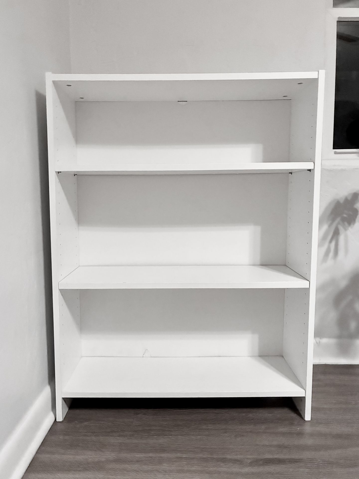 WHITE IKEA BOOKSHELF - 42”H x 31.5”W x 11”D - Adjustable shelving - Solid, works great - Small paper tear on backing at bottom, but but is still solid…just paper laminate tore - Near Northern Ave & 7th Ave