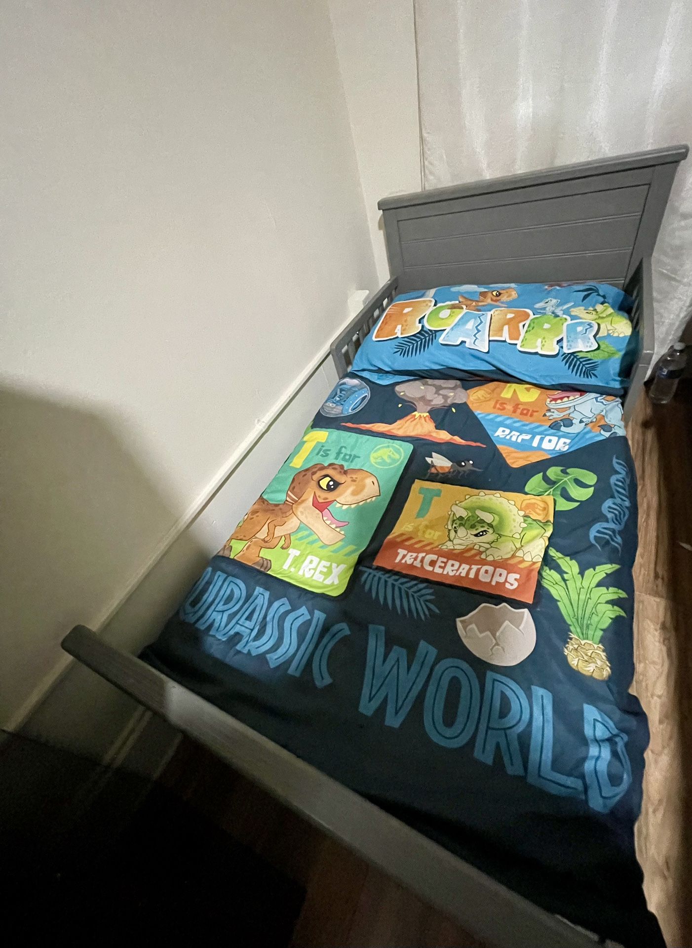Gray wooden toddler bed with Mattress included. Two Bedding Set (Dinosaurs and Star Wars.) it has couple scratches.