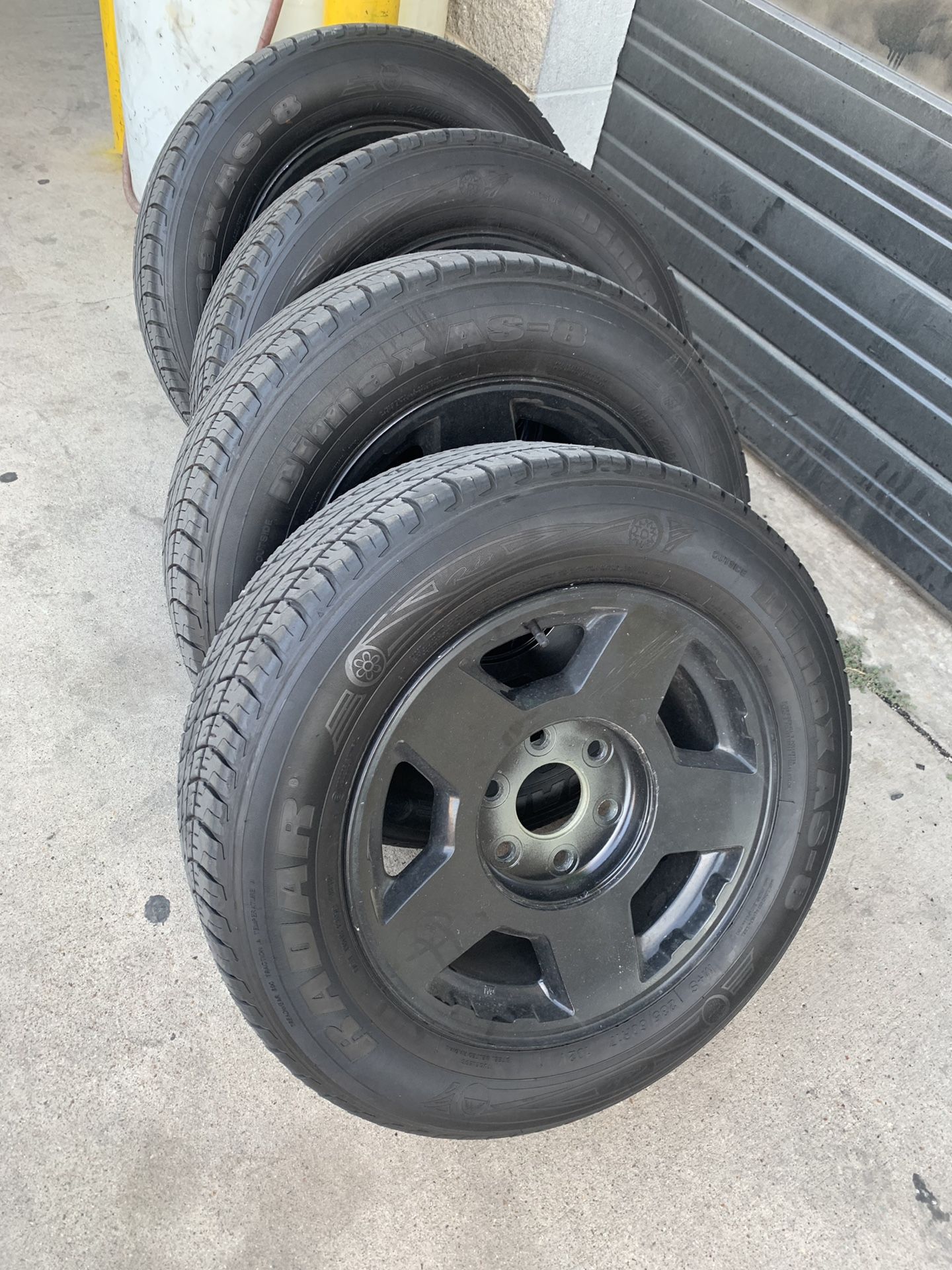 Fat five 17 on like new tires, size 235/60/17 have all caps and lugs as well. $350