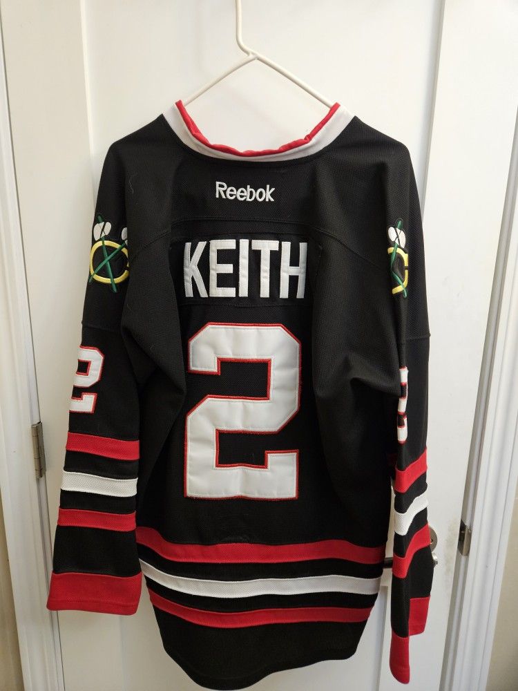 Reebok size 50 Duncan Keith Jersey. All patches, numbers and letters are stitched to Jersey, not iron on. 2013 Stanley Cup champions patch on front right side.