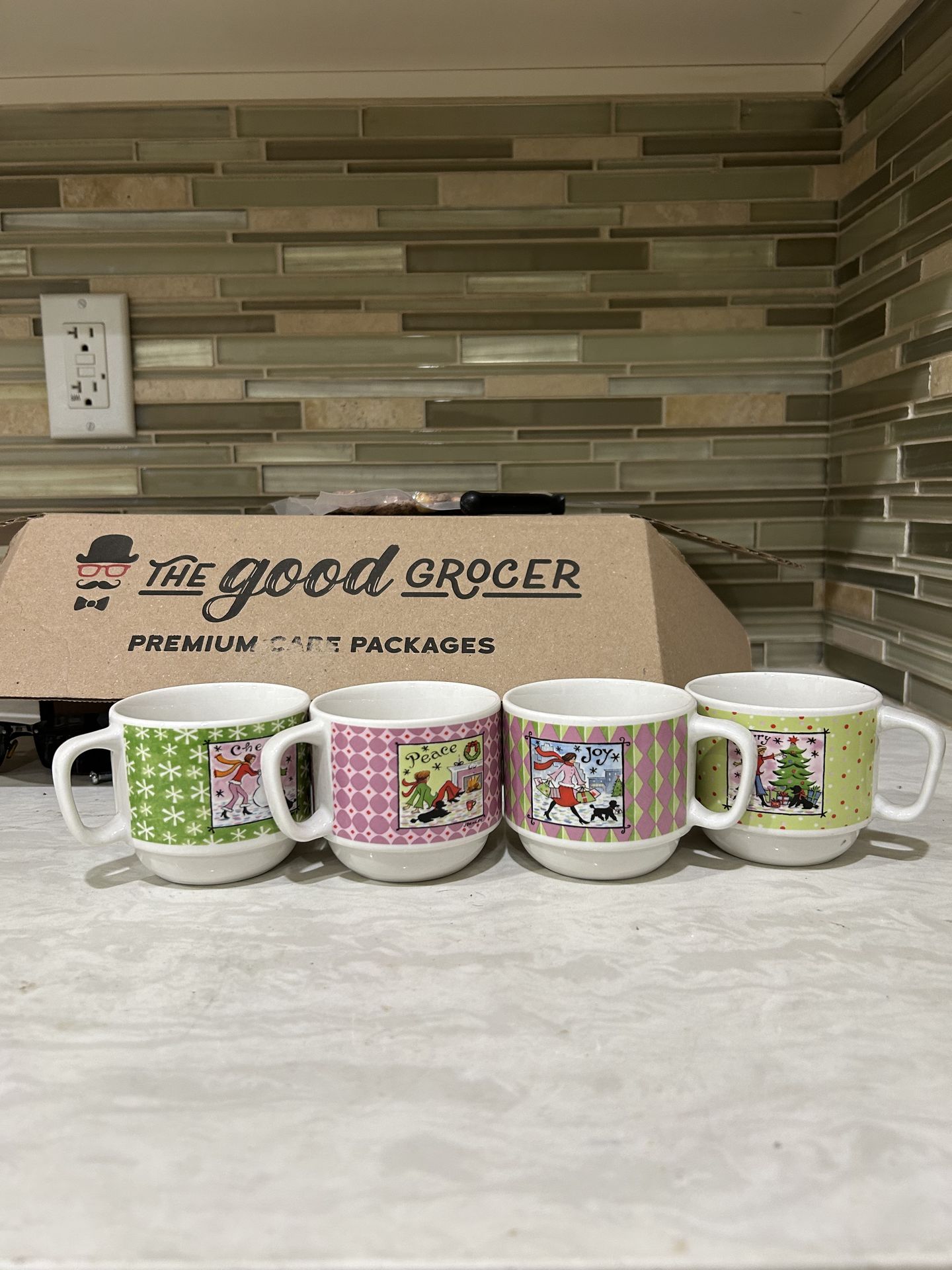 Set of 4 small teacups, perfect for holiday or everyday use • Colors: green and purple • Good condition, no chips or cracks • Great for coffee, tea, or festive table settings
