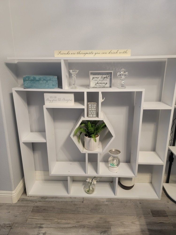 USED great condition...pick up NLV, Tropical/Camino ElDorado Pkwy. Cash only. Show off framed photos, potted plants, and artful accents in a statement-making style with this bookcase. Showcasing a striking silhouette, this modern design has eight tiers of different heights and widths that provide a place for prized possessions of all sizes. Plus, there’s room up top for even more décor. Other items NOT included. Dimensions Overall 52'' H X 52'' W X 8.6'' D Shelf 8.6'' D Overall Product Weight 57 lb.