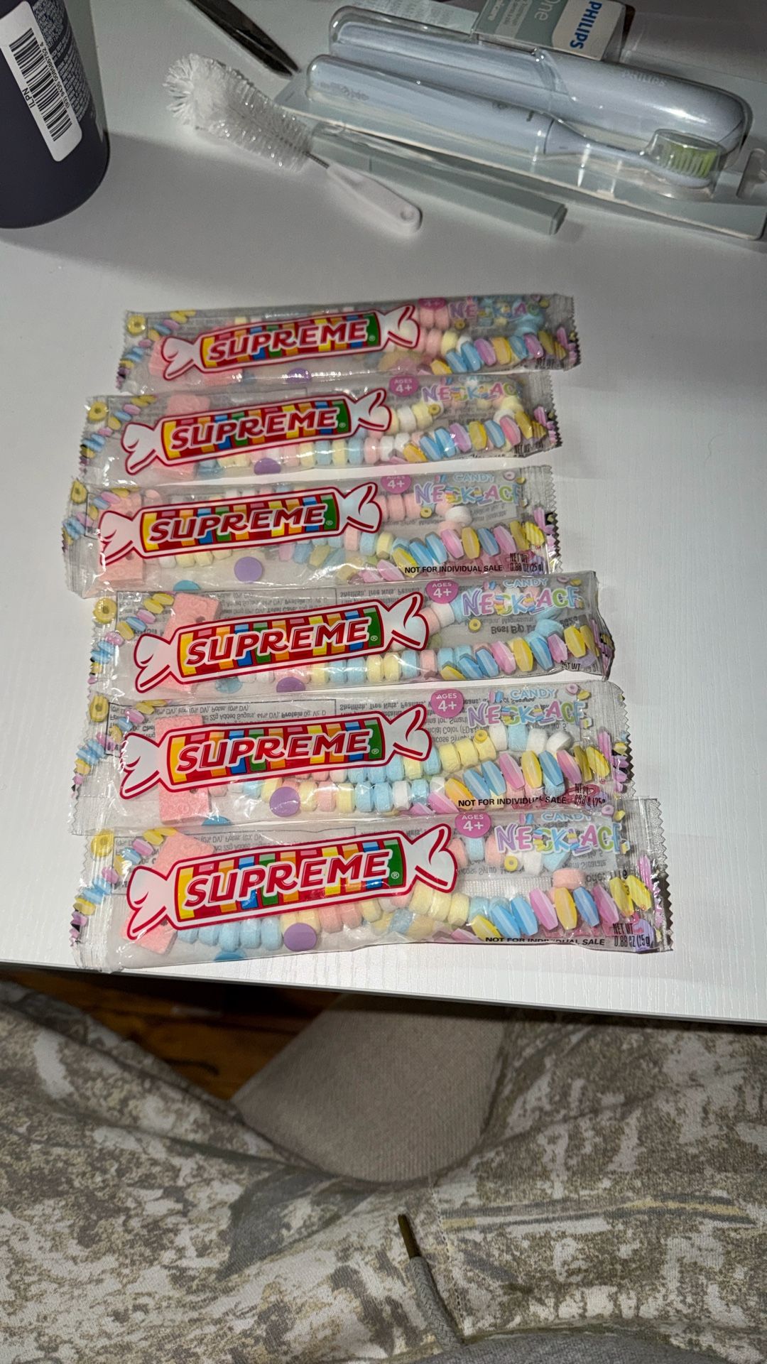 Supreme Style Candy Necklaces Novelty Only Pack of Supreme-style candy necklaces. These are novelty items with a Supreme-inspired design and are not official Supreme merchandise. Not fit for human consumption sold strictly as novelty, display, or prop items. • Candy necklace style novelty • Individually packaged • New and unopened • Sold as a bundle (see photos) Great for party décor, photo props, gag gifts, or streetwear-inspired collectibles. 6 pack