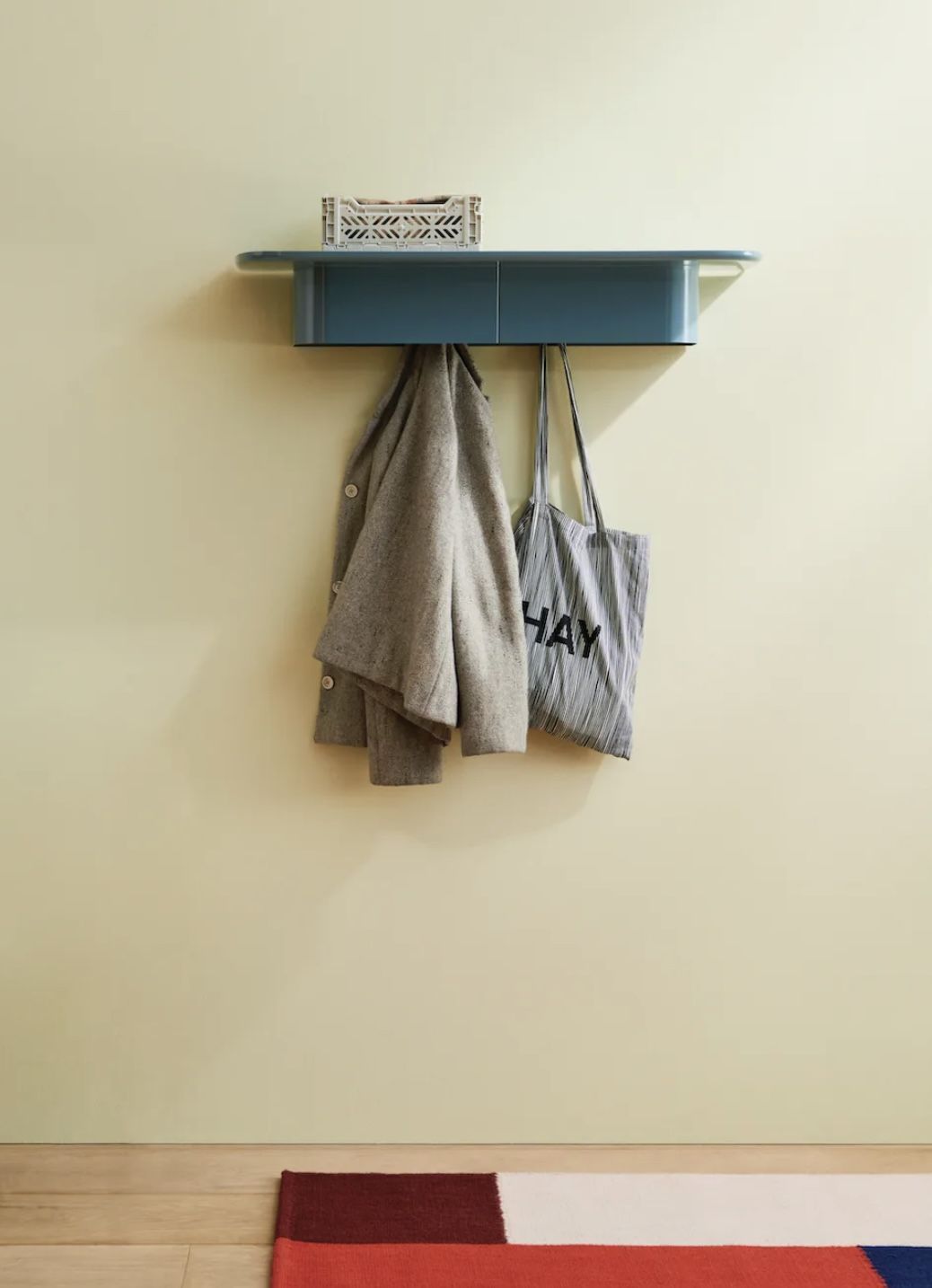 HAY Korpus Shelf, size medium, midnight blue color, has 4 concealed hooks and keyhole slits to wall mount. There is a faint scratch on the top of the shelf and a small dent on the left corner. See photos and DM with any questions. Comes with original screws. Good condition.