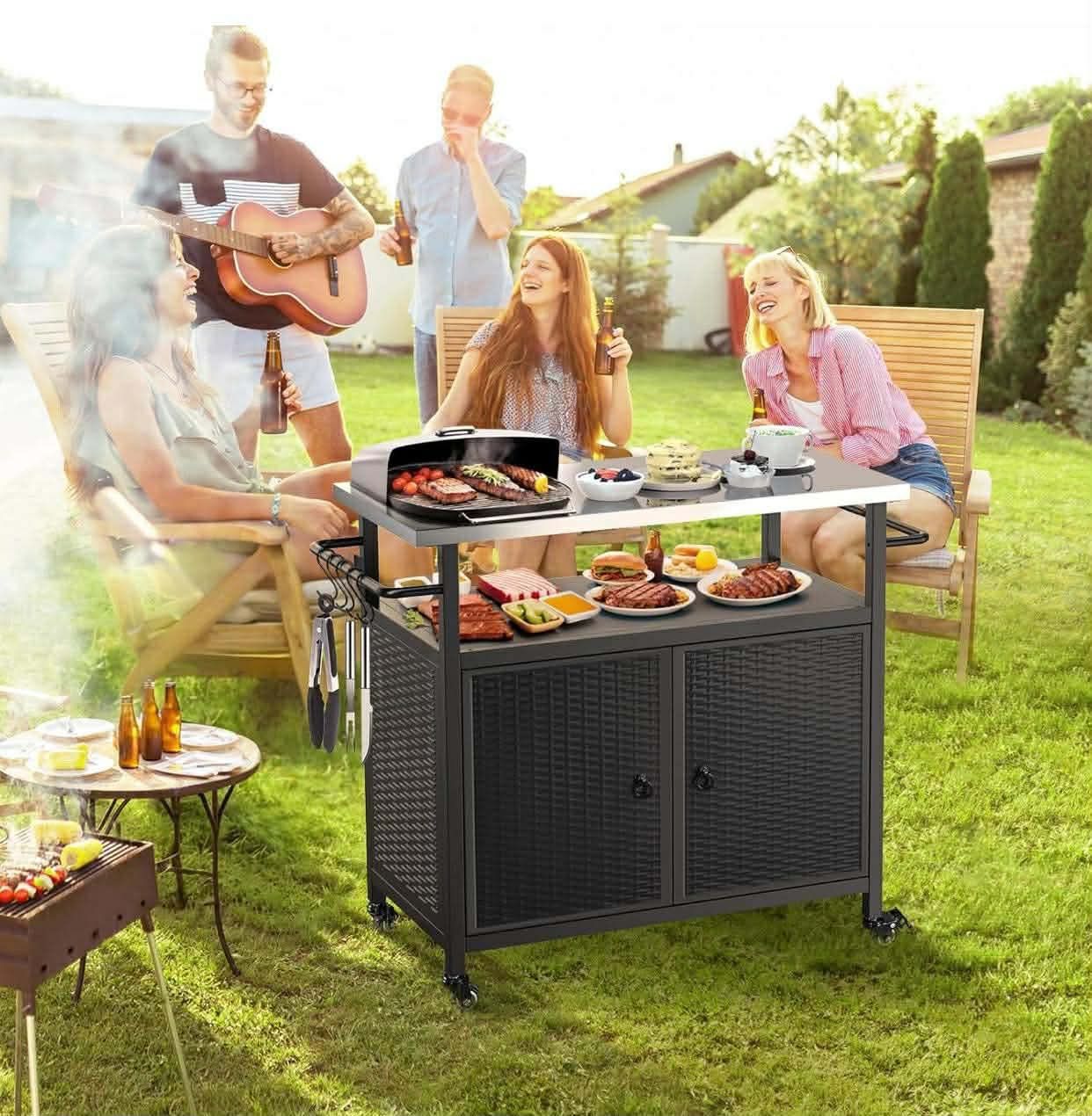 Outdoor Grill Cart with Storage, Outdoor Bar Cart with Wheels, Kitchen Island Cart with Stainless Steel Top for BBQ, Patio, Backyard
