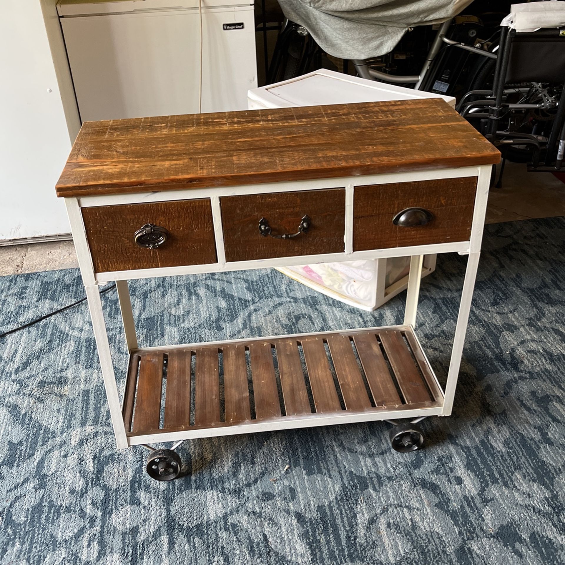 Cart has metal wheels and is great for outdoor barbiques has two tiers and three drawers measures 30x32x14 metal frame