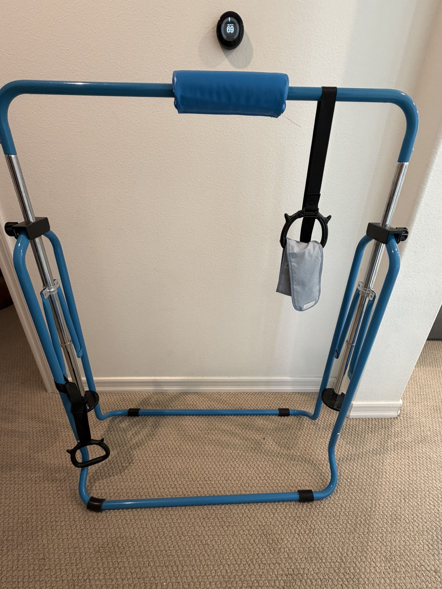 Kids gymnastics bar for home training: adjustable height blue steel frame, perfect for pull-ups, kips, handstands, and basic tumbling (ages 3-10, ~110-165 lb capacity). Includes matching thick blue foam pad/mat for safe landings. Sturdy non-slip base, padded grips, easy fold/store. Great condition—light home use, fully functional. hangin items like the grip in pics can be remove