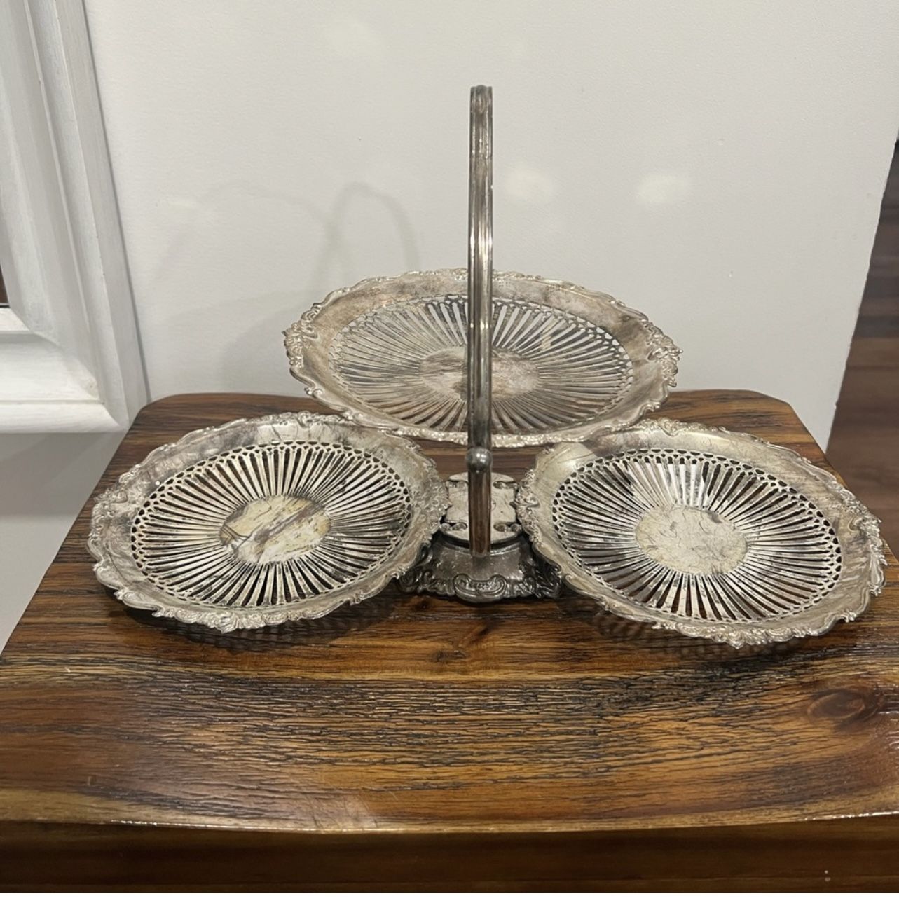 Rare Vintage GODINGER Silver BAROQUE Pierced Etched Floral Design Folding 3 TIER Pedestal Base Tidbit/Dish Server w/Handle. Just needs to be cleaned