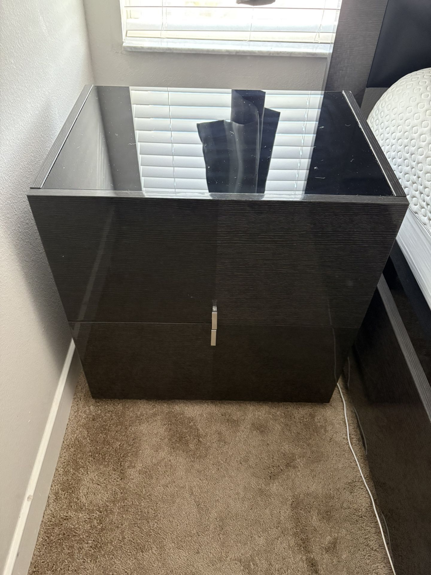 Add a sleek, modern touch to your bedroom with this stylish black gloss nightstand. Features a smooth glass top, high-gloss front panels, and a sturdy wood finish. Details: • Two spacious drawers • Modern chrome handle • Glass top for a premium look • Solid and well-built • Gently used and in great condition •No damage Perfect for any contemporary bedroom setup. Smoke-free, pet-free home. Dimensions: Approx. 24” H × 22” W × 16” D Price: $ 120 Pickup only