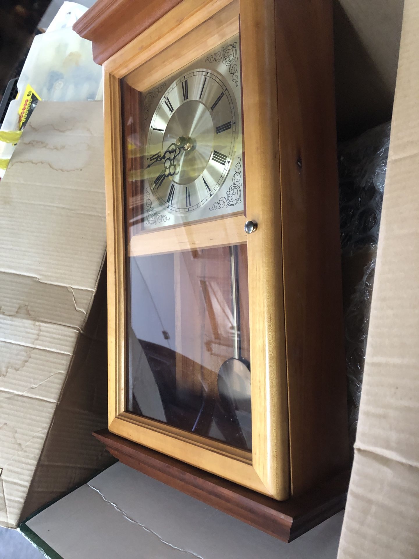 The is a new solid wood wall clock with door snd pendulum, great condition