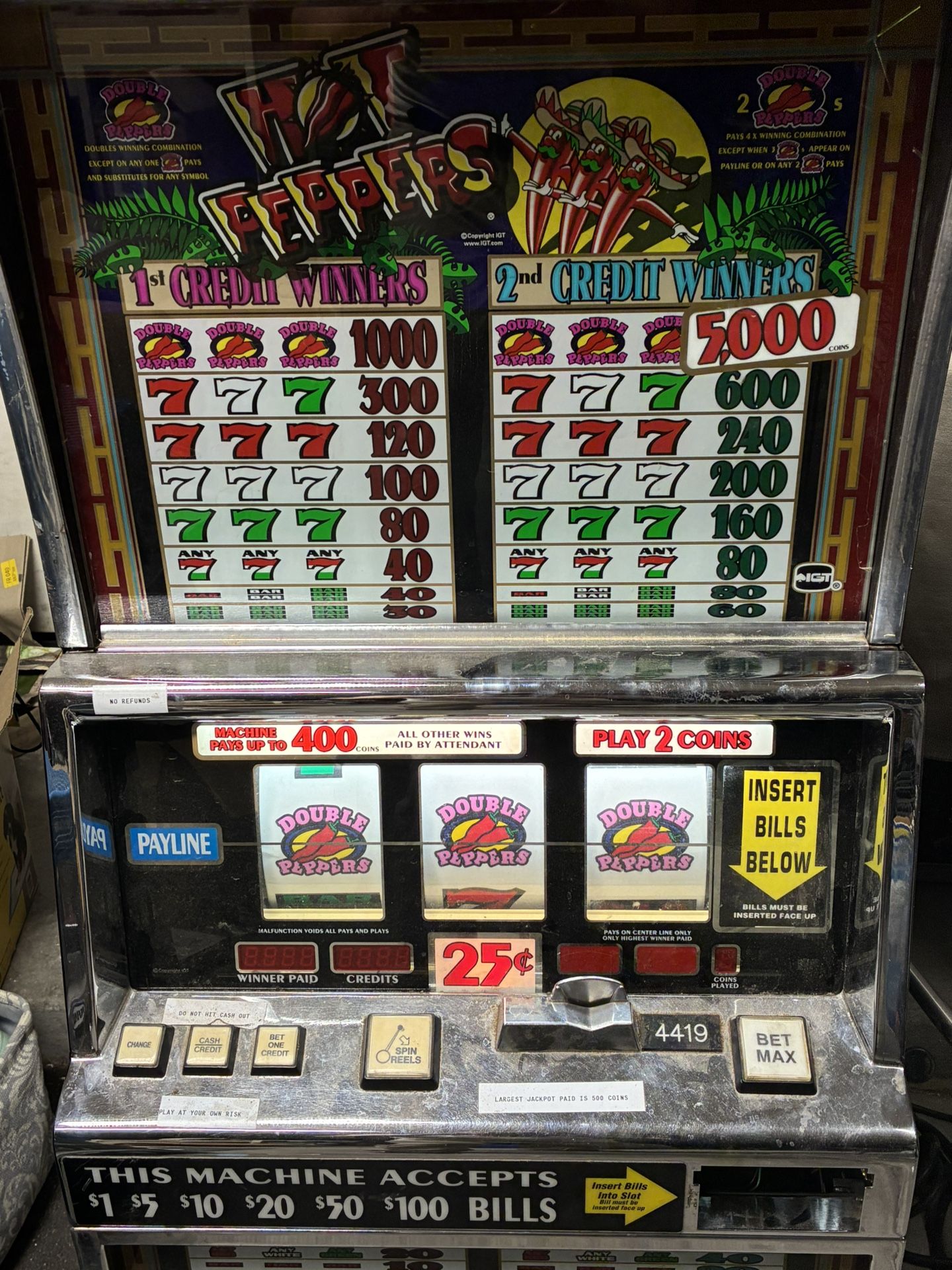 Hot Peppers slot machine by IGT 2 quarter max bet All the parts are there and it lights up but it doesn’t spin the reels. I bought a few of these machines in a bulk deal and this unit was working but something happened is what was told not sure what it needs. But it is complete. In decent shape as it sits it looks cool as a conversation piece.