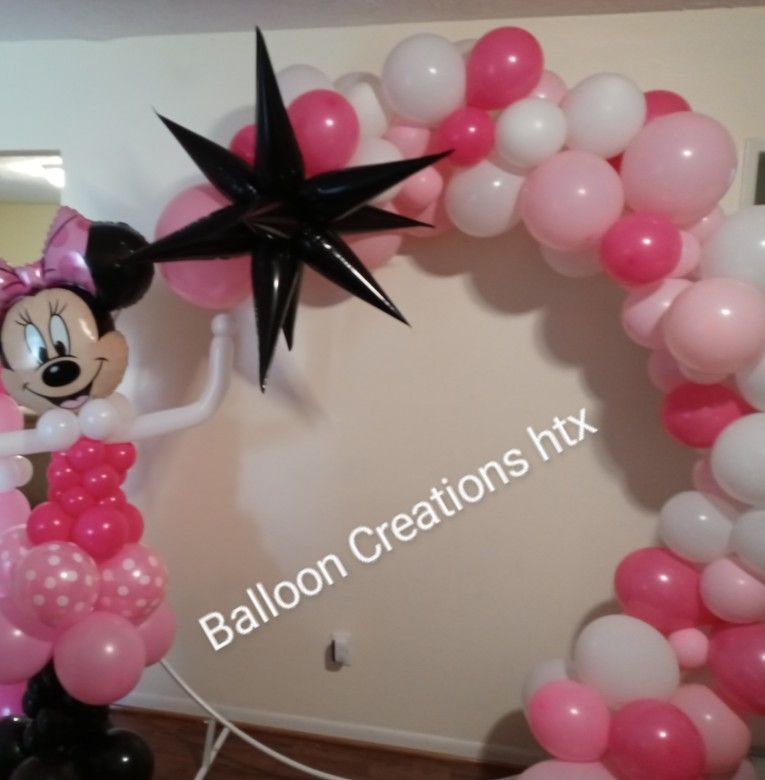 Minnie mouse 5 ft balloon character $55 / 7ft circle backdrop. / balloon garland $ 165 / centerpieces $12 each /cake table arch $65