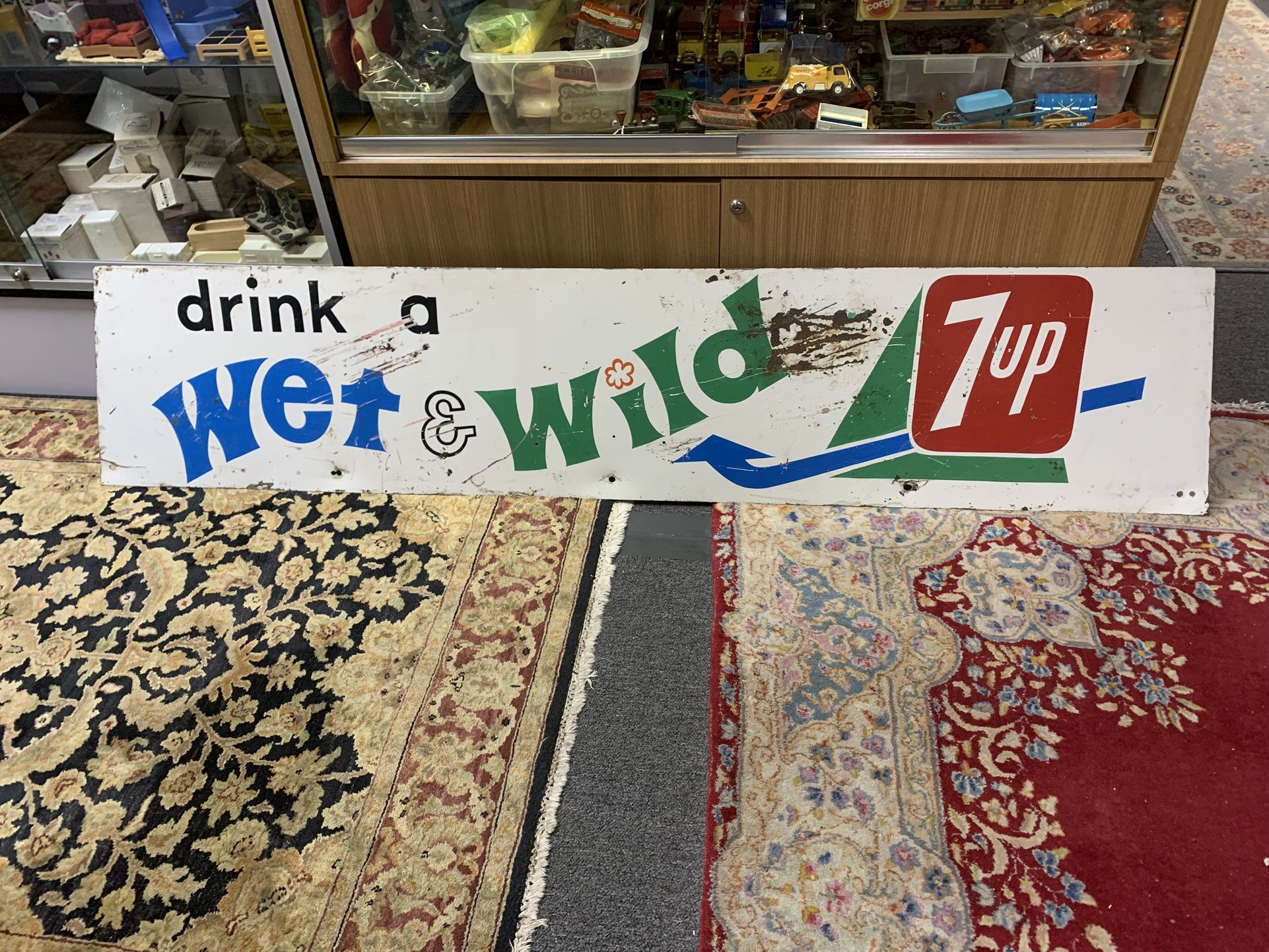 Vintage Large 7 Up Wet & Wild Metal Sign $425 plus sales tax Measures about: 72 1/2” wide and 15” tall Please see photos for location and other info