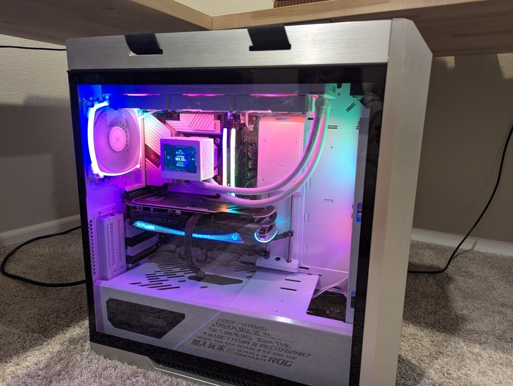 This is a premium, enthusiast-level gaming and productivity PC built with top-tier components. The system runs flawlessly and has been fully tested and benchmarked, scoring an exceptional 17,228 PassMark score, placing it among the highest performing systems with this CPU. Perfect for 1440p ultra, 4K gaming, streaming, video editing, or professional workloads. Full Specs: • CPU: Intel Core i7-14700K (20 cores / 28 threads, up to 5.6GHz boost) • Cooler: ASUS ROG Ryujin III 360mm ARGB Liquid Cooler with customizable LCD screen • GPU: Zotac GeForce RTX 4070 Ti 12GB • RAM: 64GB Corsair Vengeance DDR5 6400MHz • Storage: 2TB MSI M480 Pro NVMe SSD • Motherboard: MSI PRO Z790-A MAX WiFi (WiFi 6E, Bluetooth) • Power Supply: Corsair RM1000x 1000W Gold • Case: ASUS ROG Strix Helios Full Tower (premium airflow and build quality) • Runs modern games at ultra settings effortlessly • Excellent temperatures and stability • Fast boot and load times • Fully functional, no issues • Clean, well maintained • Fresh Windows 11 install • Ready for plug-and-play Asking $1749 OBO Shoot me a DM with any questions.