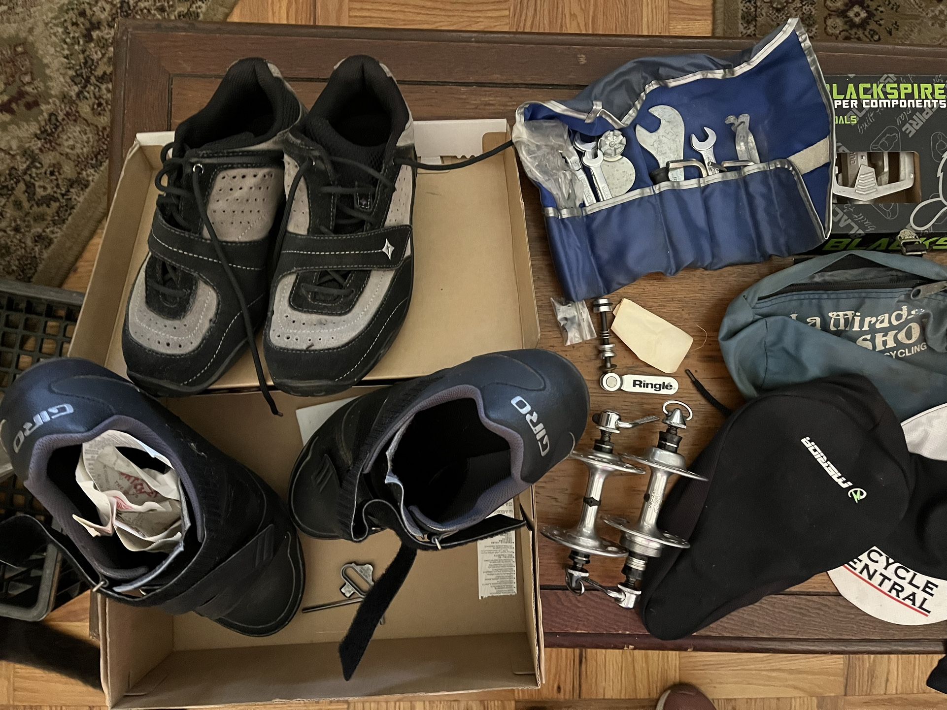 Giro men Carbide “R” shoe sz 11 $10 Specialized women shoe sz 7-1/2 $10 Campagnolo hubs front/rear $100 SOLD Ringle seat post release Eldi tool kit with extras $20 SOLD Shimano (BMX) pedals PD-MX15 Pearl Izumi men riding shorts $10 SOLD Canari men riding shorts B-string protective bras purple & silver $15 each Merida soft seat cover $3 Pick up in Glendora 91740