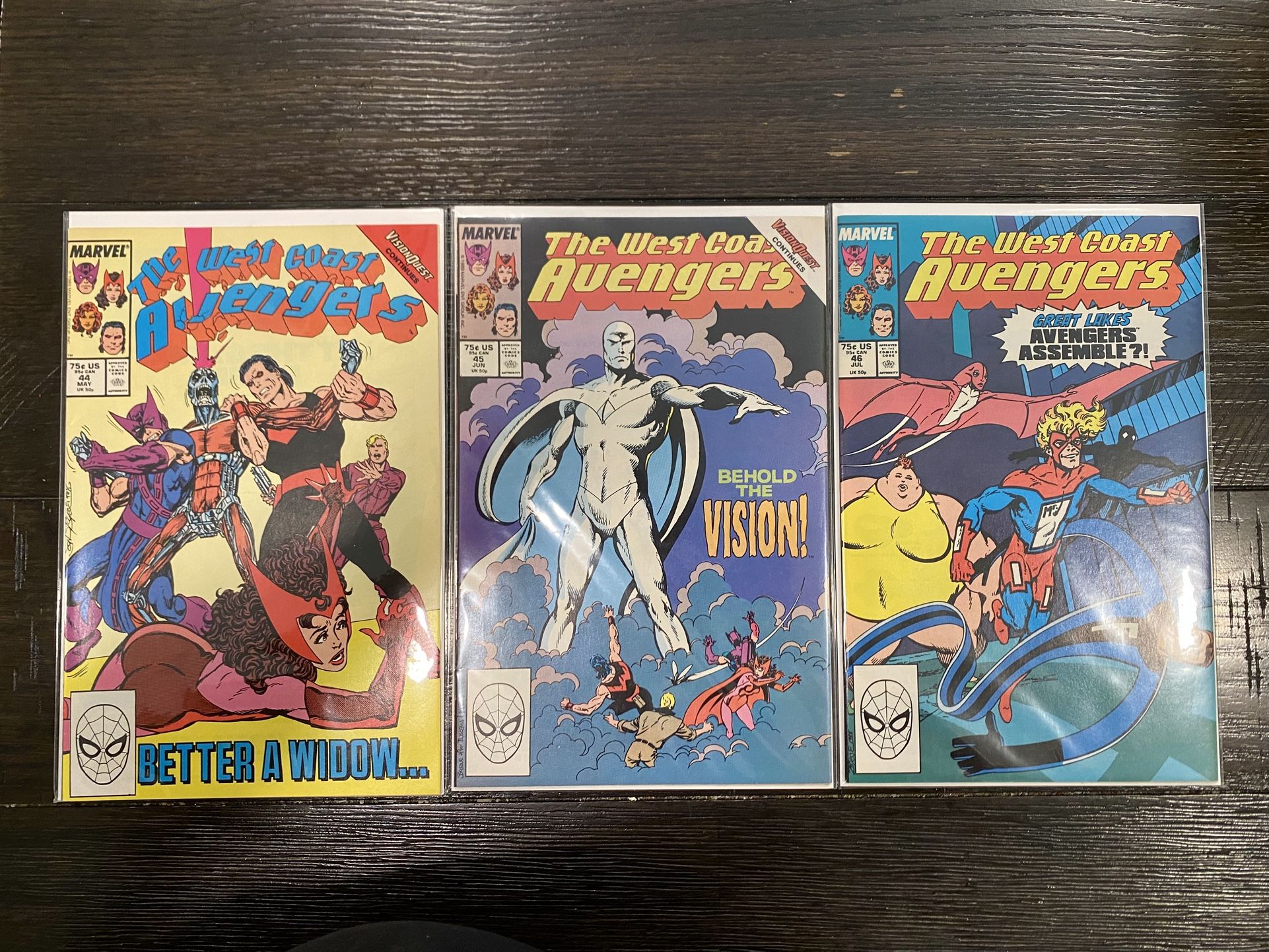 ***Read Before Messaging*** Selling Marvel Comic Book The West Coast Avengers numbers 44 45 and 46. Not a professional grader so please review all images, with that being said while they all vary condition for the most part l will say all are in over all good condition, not pristine but far from poor condition. All come with bag and board. Selling together only. Price is firm. - Message only if you really intend on buying - Message when ready to pick up - Must be able to pick up in Rowland Heights - First come, first served. No holds - Cash only. Only accept money at pick up.