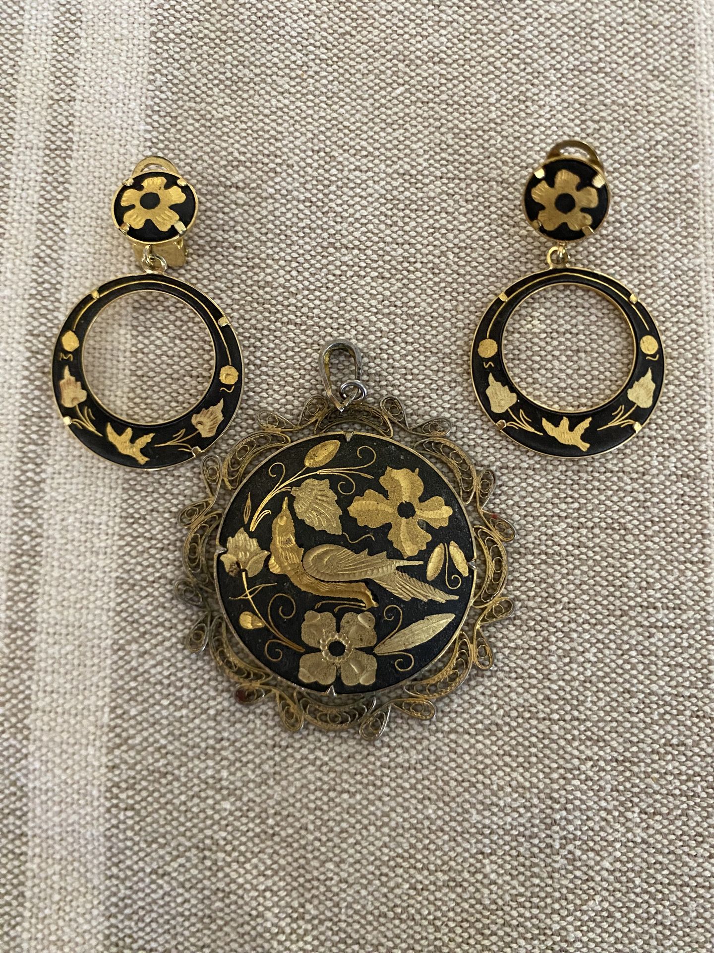 Beautiful Earring and Pendant set without the chain, Bkack snd Gold tone Cloisonné Enamel very detailed birds, flowers, Fillagree pendant , Vintage