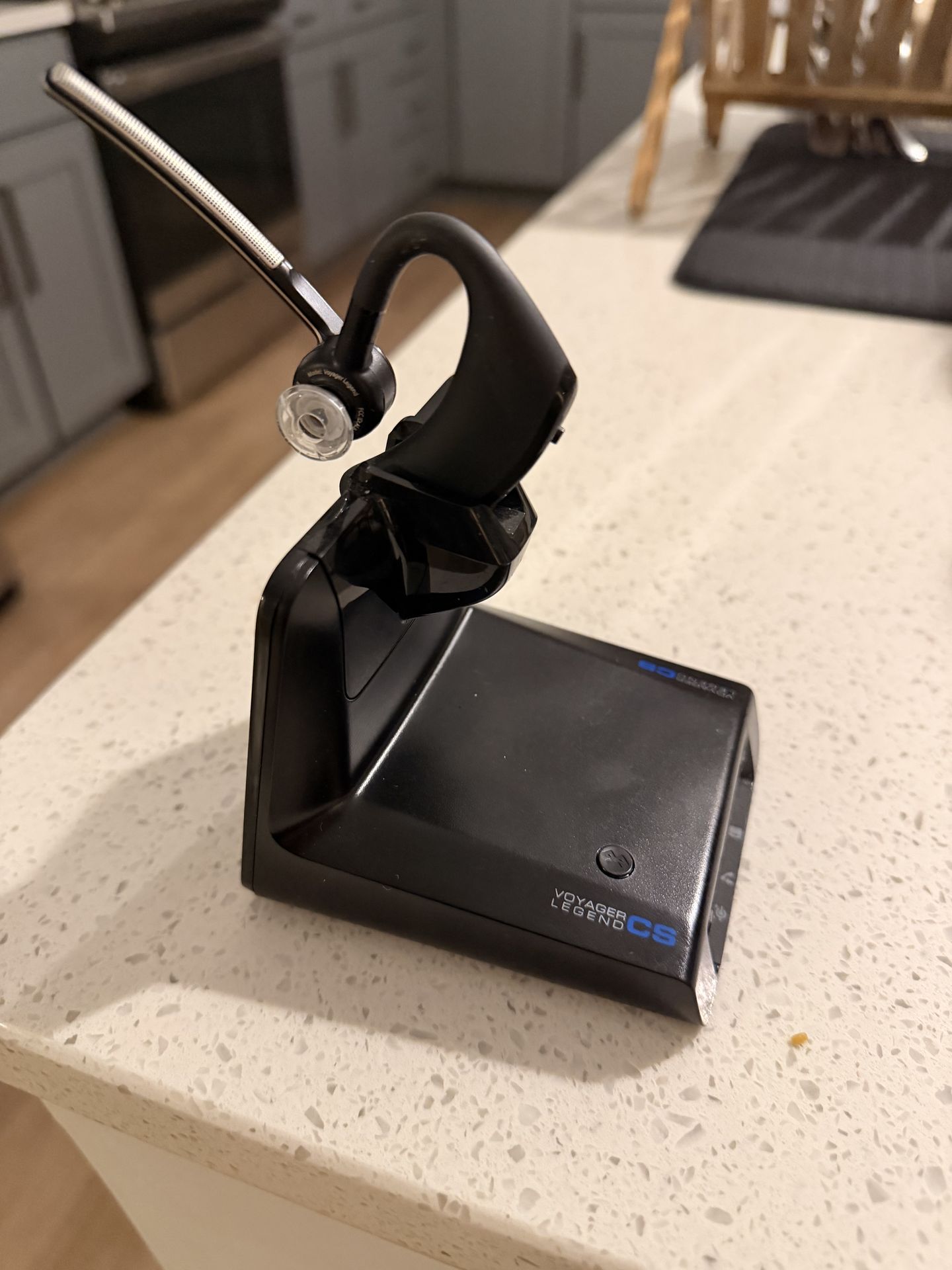 Planteonics Voyager Legend CS Desktop Headset Kit - Good condition… used for about two years Pic 1: Headset, wires and eartips Pic 2: Light shows it’s on and charging Pic 3: Bottom of charging stand…zoom in for model number Pic 4: Actual headset Pic 5: Model number of headset