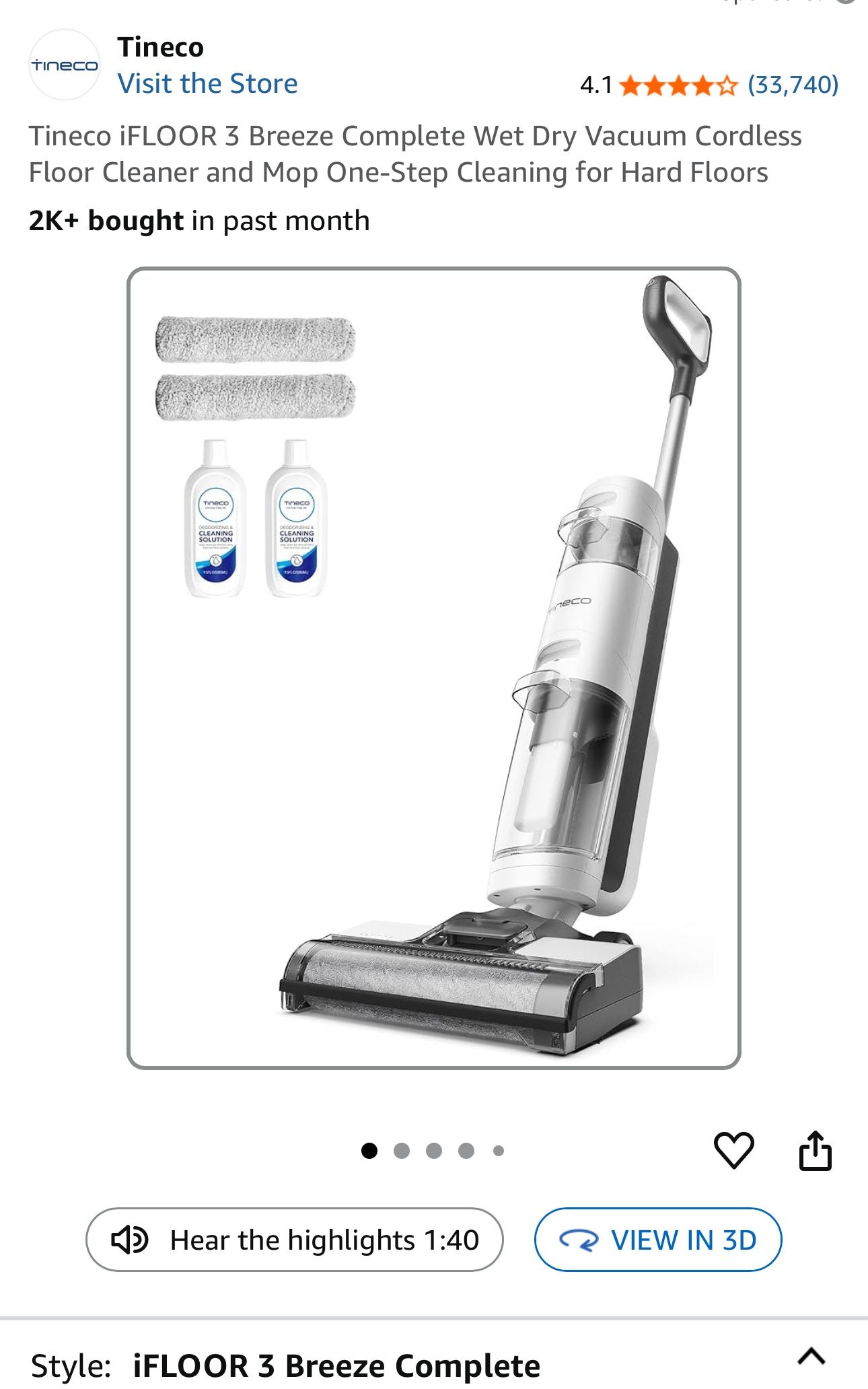 Tineco iFLOOR 3 Breeze Complete Wet Dry Vacuum Cordless Floor Cleaner and Mop One-Step Cleaning for Hard Floors