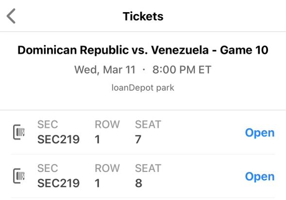2 tickets to tonight’s WBC game. DR vs VENEZUELA $175 EACH