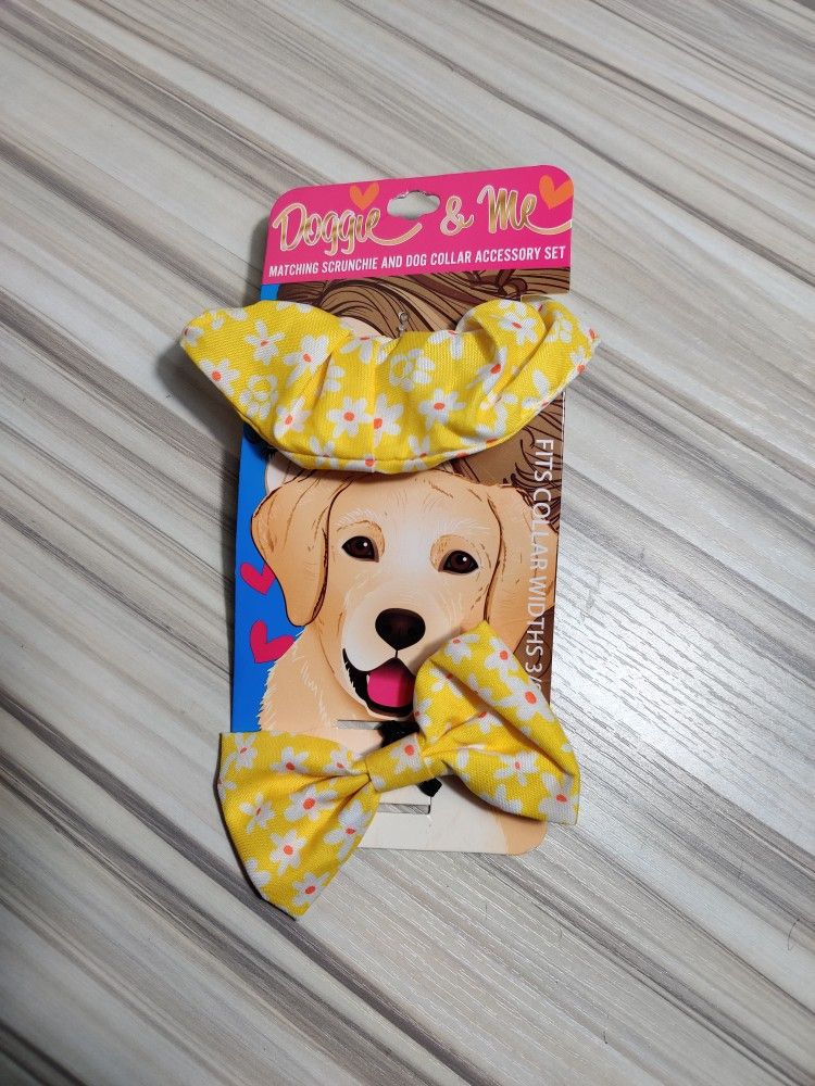 Match your pooch with this scrunchie and bow tie set. The scrunchie and bow tie are a matching yellow with a white/orange daisy print. The bow tie has an elastic loop that slips onto any pet collar. The set works for dogs or cats. Condition: New