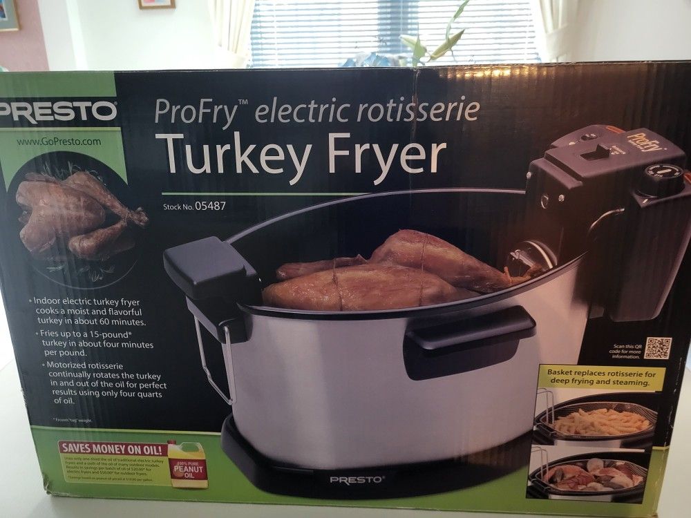 Presto ProFry Electric Rotisserie Indoor Deep Fryer, Steamer, model 05487. Stainless steel 5.3 quart oil capacity and operates at 1800W. Includes rack, pot, lid, basket, base, handle and manual.