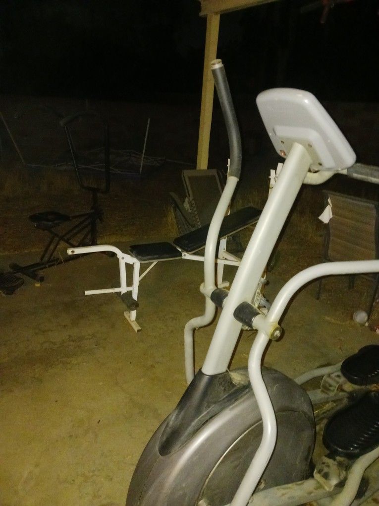 Various items fron pull up bar to weight chair to weights elliptical and workout bike prices vary from $14-$105 all items in great working condition just a bit dusty from not being used. Dusty but works well weight bench is $115 elliptical $80 ab crunch $50 pull up bar $14