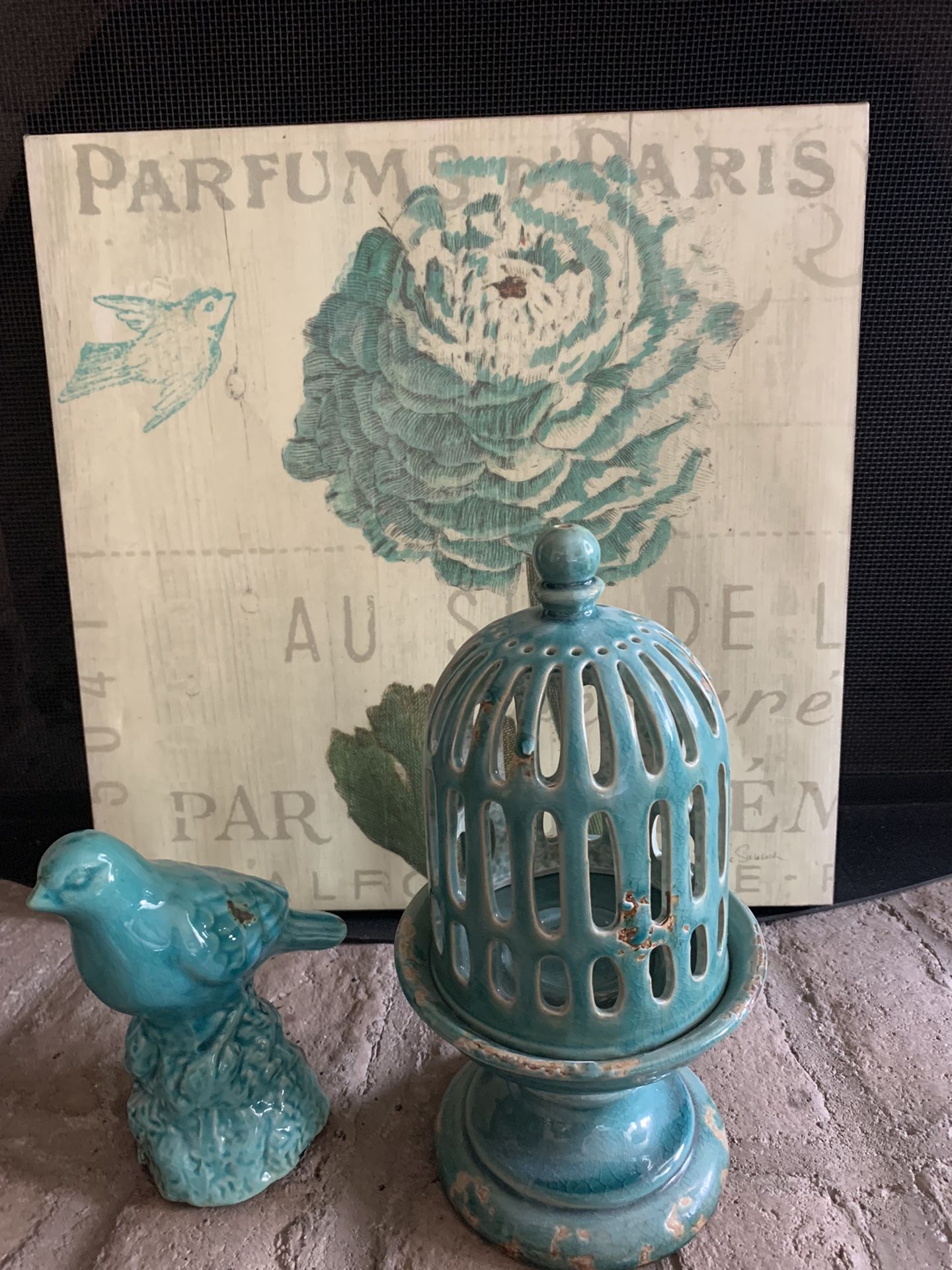 Ceramic Bird 8”, and Cage 12”, with Picture 18”x18”, picture canvas over wood frame