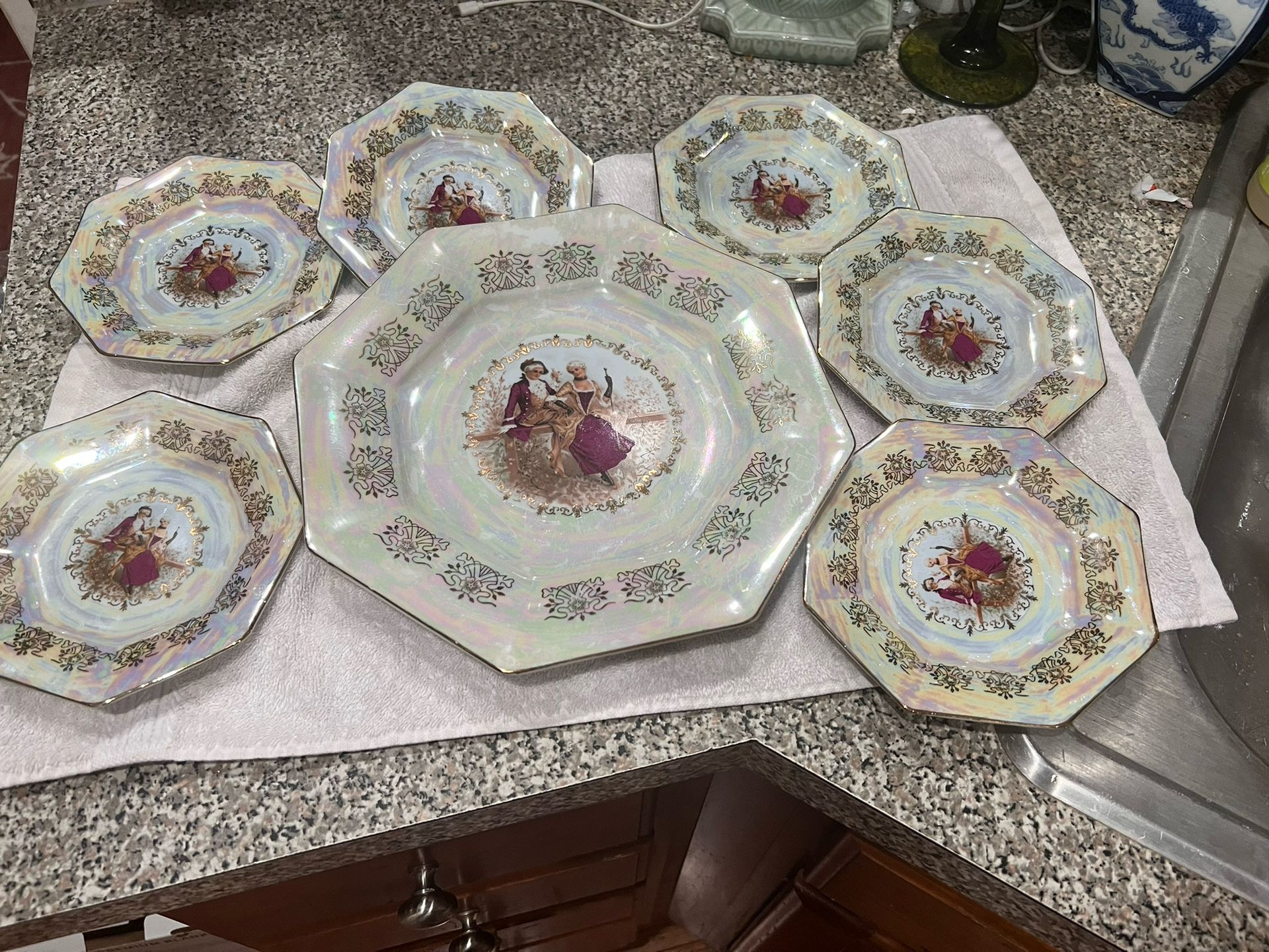 Vintage Japan Opal Iridescent w/ Gold Dinner Plate W/ Six Side Plates
