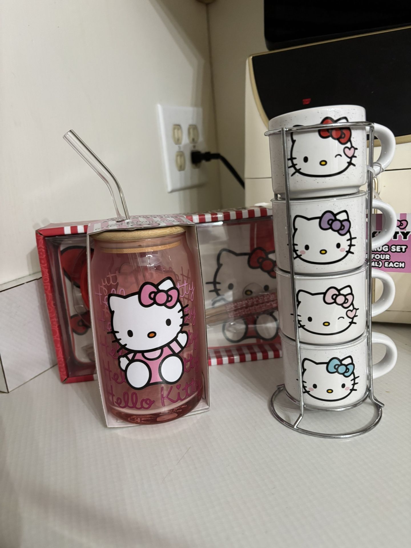 Hello kitty 3 piece ceramic sushi set Hello Kitty 16oz. Glass tumbler with bamboo lid and glass straw Hello Kitty 4 piece mini mug set (espresso mug)